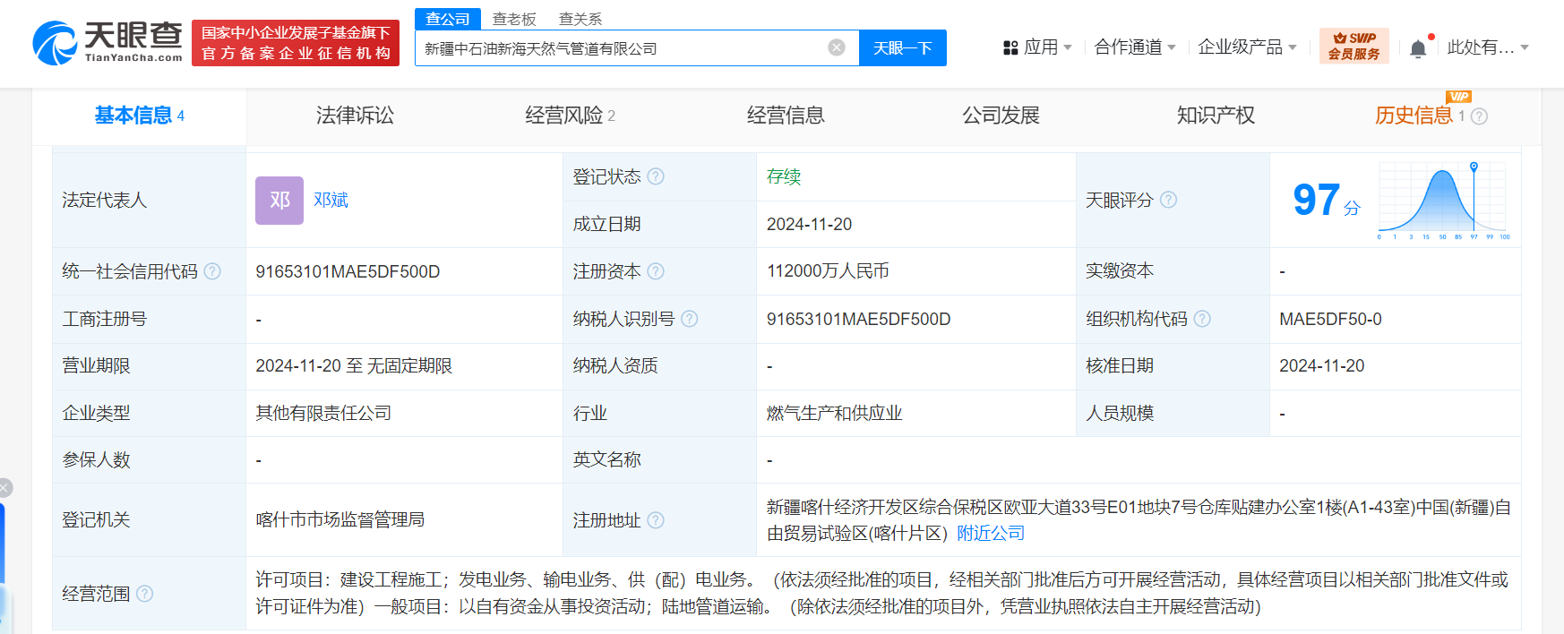 天眼查App显示,近日,新疆中石油新海天然气管道有限公司成立,法定代表人为邓斌,注册资本11.2亿人民币,经营范围为建设工程施工,发电业务、输电业务、供(配)电业务,以自有资金从事投资活动,陆地管道运输。股东信息显示,该公司由中国石油(601857)、新疆亚新煤层气投资开发(集团)有限责任公司分别持股65%、35%。