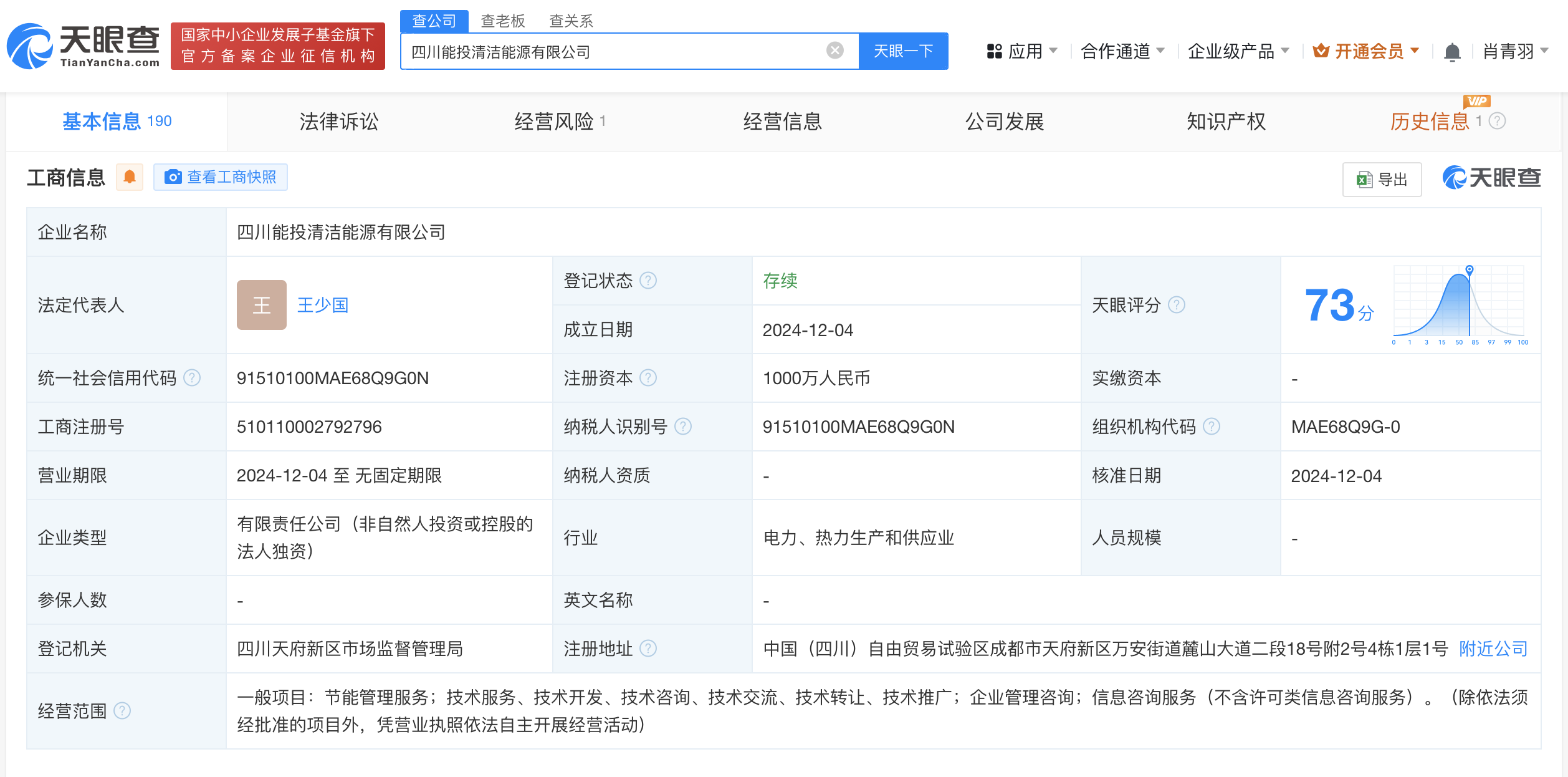 天眼查App显示,近日,四川能投清洁能源有限公司成立,法定代表人为王少国,注册资本1000万人民币,经营范围含节能管理服务、企业管理咨询、信息咨询服务等。股东信息显示,该公司由四川能投资本控股有限公司全资持股。