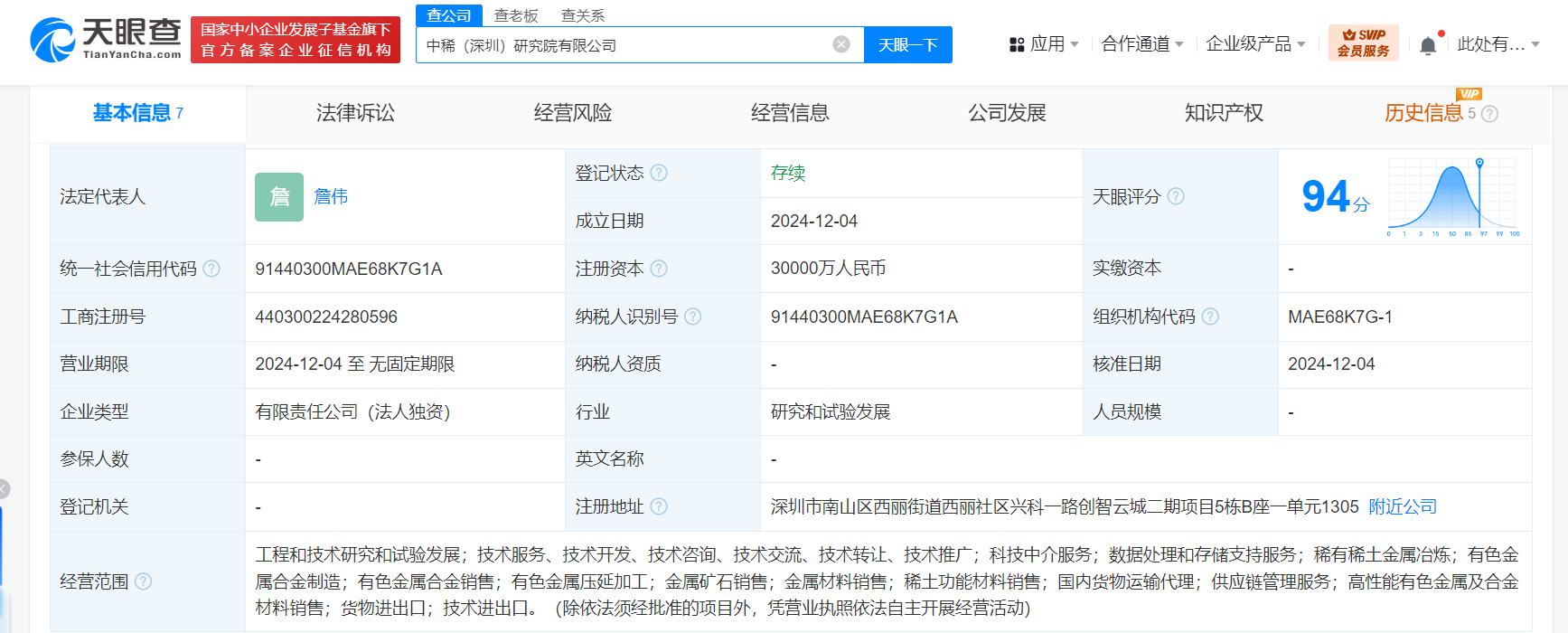 天眼查App显示,近日,中稀(深圳)研究院有限公司成立,法定代表人为詹伟,注册资本3亿人民币,经营范围含工程和技术研究和试验发展、科技中介服务、数据处理和存储支持服务、稀有稀土金属冶炼、有色金属合金制造、有色金属合金销售、有色金属压延加工、金属矿石销售等。股东信息显示,该公司由中国稀土集团有限公司全资持股。