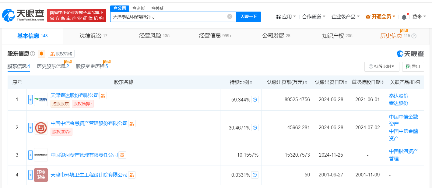 天津泰达环保有限公司成立于2001年11月,法定代表人为王天昊,经营范围含以自有资金对环保类项目的投资及运营管理、固体废弃物的综合利用及其电力生产等,现由泰达股份(000652)、中信金融资产(HK.02799)、天津市环境卫生工程设计院有限公司及上述新增股东共同持股。