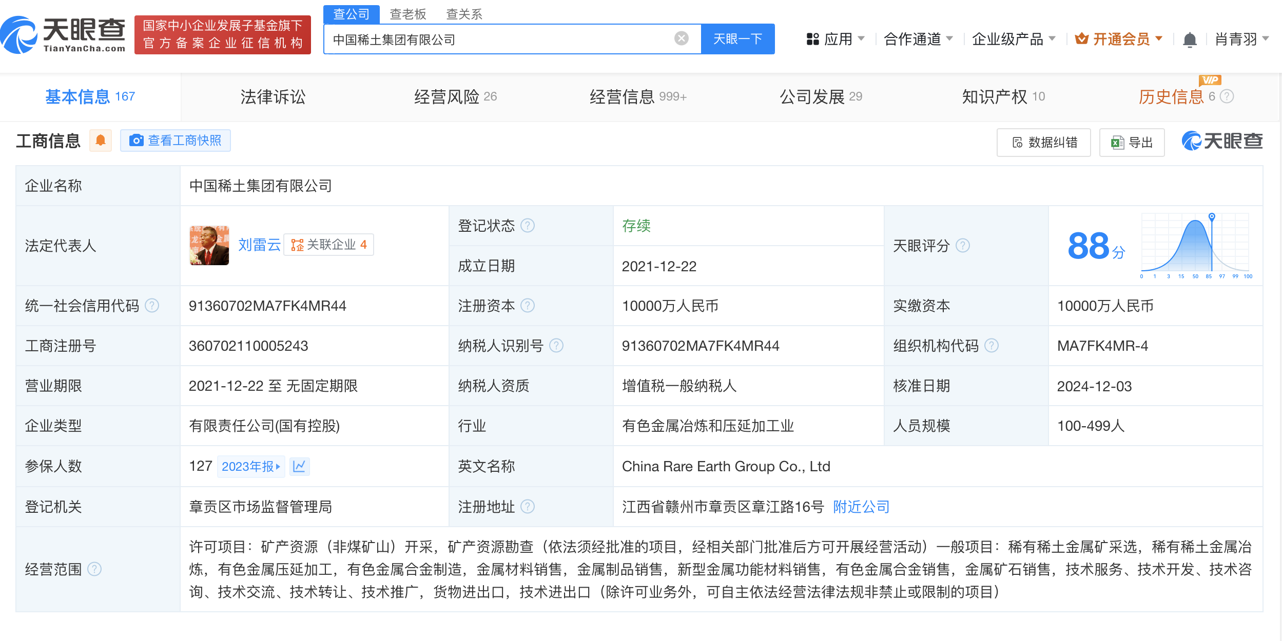 天眼查App显示,近日,中国稀土集团有限公司发生工商变更,敖宏卸任法定代表人、董事长,由刘雷云接任,同时张国厚卸任董事,由王义栋接任。