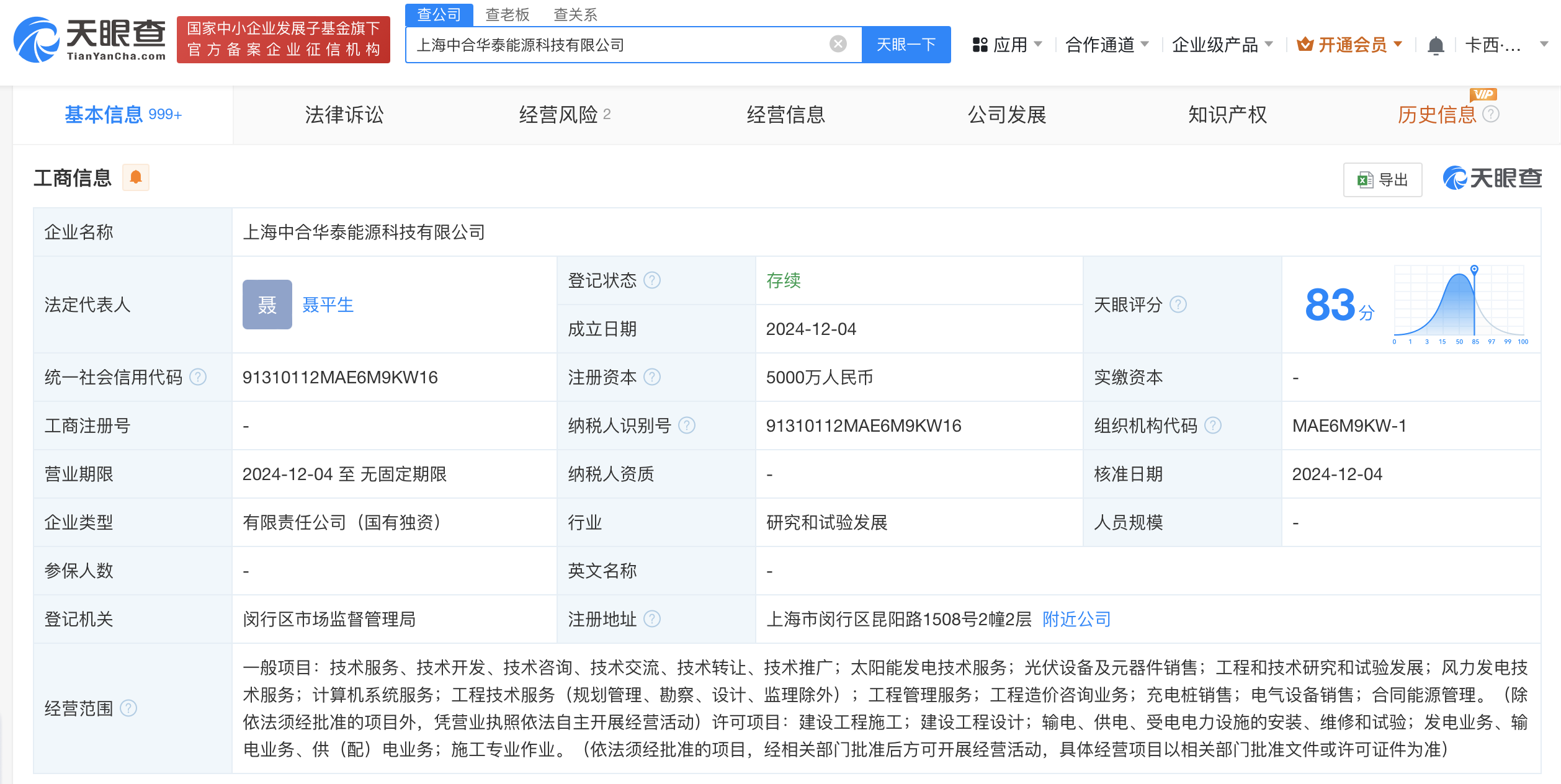 天眼查App显示,近日,上海中合华泰能源科技有限公司成立,法定代表人为聂平生,注册资本5000万人民币,经营范围含太阳能发电技术服务、光伏设备及元器件销售、工程和技术研究和试验发展、风力发电技术服务、充电桩销售等。股权全景穿透图显示,该公司由中核华泰建设有限公司全资持股,后者为中国核建(601611)全资子公司。