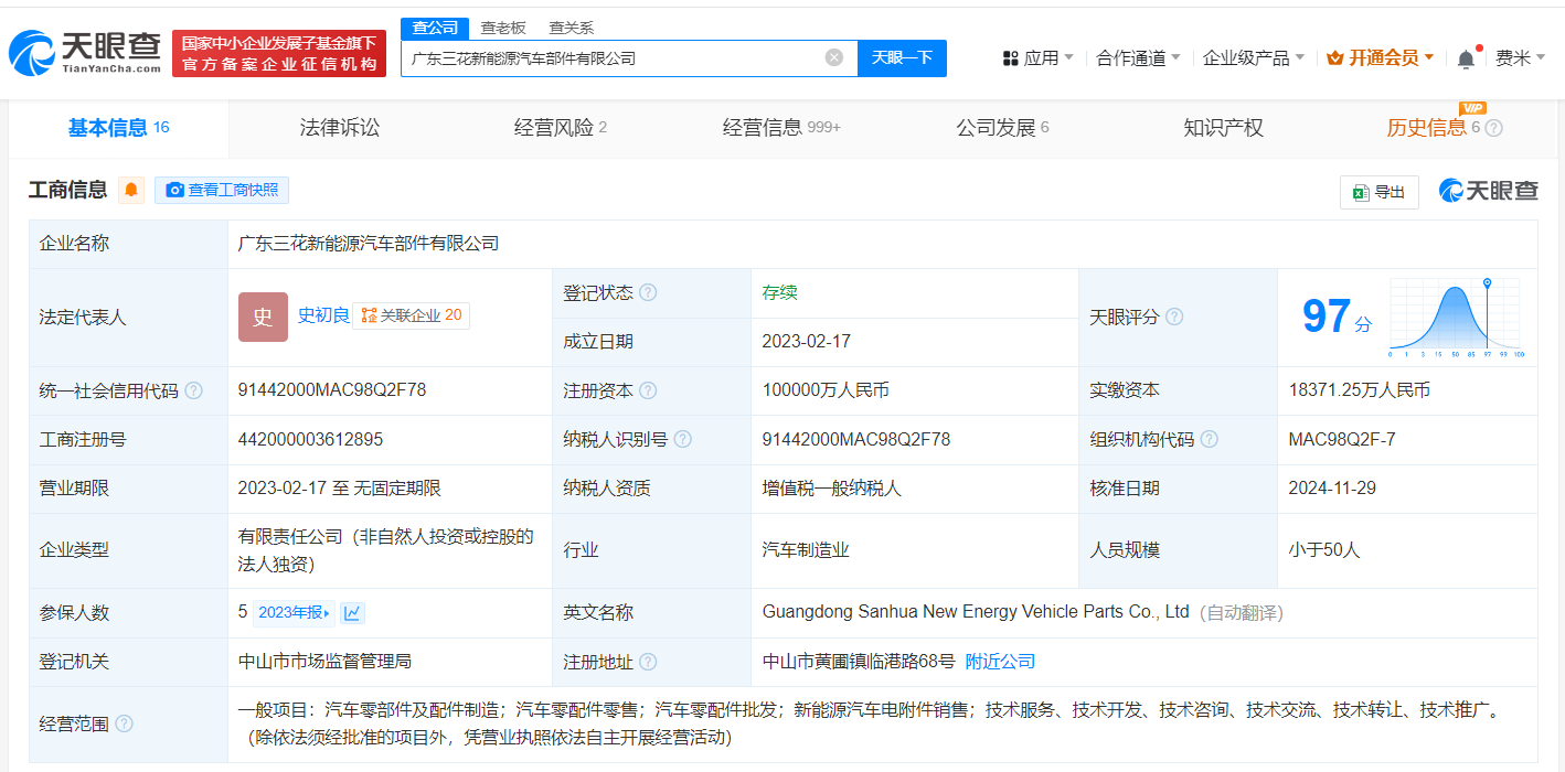 广东三花新能源汽车部件有限公司成立于2023年2月,法定代表人为史初良,经营范围含汽车零部件及配件制造、汽车零配件零售、汽车零配件批发等。股权全景穿透图显示,该公司由三花智控(002050)旗下浙江三花汽车零部件有限公司全资持股。
