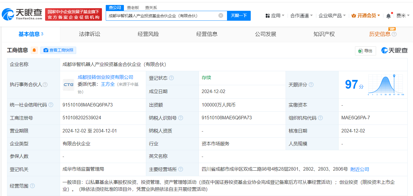 天眼查App显示,近日,成都华智机器人产业投资基金合伙企业(有限合伙)成立,执行事务合伙人为成都技转创业投资有限公司,出资额10亿人民币,经营范围为创业投资,以私募基金从事股权投资、投资管理、资产管理等活动,由成都市重大产业化项目二期股权投资基金有限公司、成都成华产业振兴股权投资基金合伙企业(有限合伙)、成都技转创业投资有限公司共同出资。