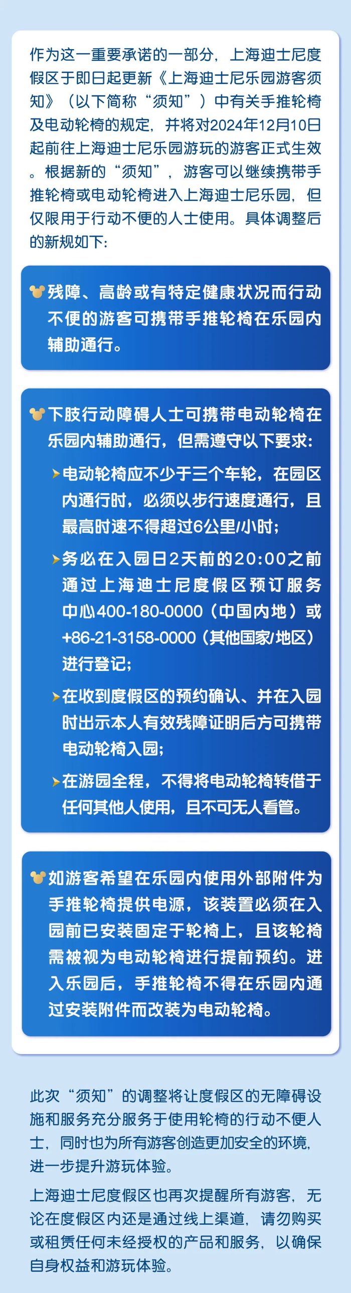 上海迪士尼度假区宣布将于12月10日起正式实施电动轮椅新规。其中指出,游客可以继续携带手推轮椅或电动轮椅进入上海迪士尼乐园,但仅限用于行动不便的人士使用。