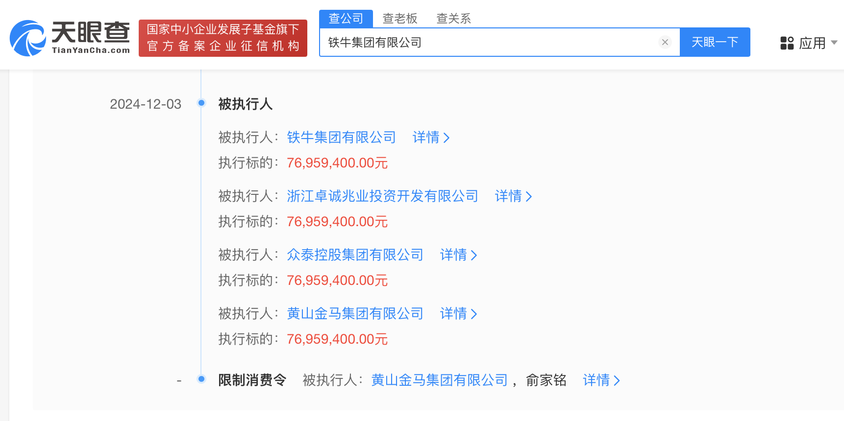 天眼风险信息显示,铁牛集团有限公司现存3条被执行人信息,被执行总金额超8亿元。此外,该公司还存在多条限制消费令和股权冻结信息。