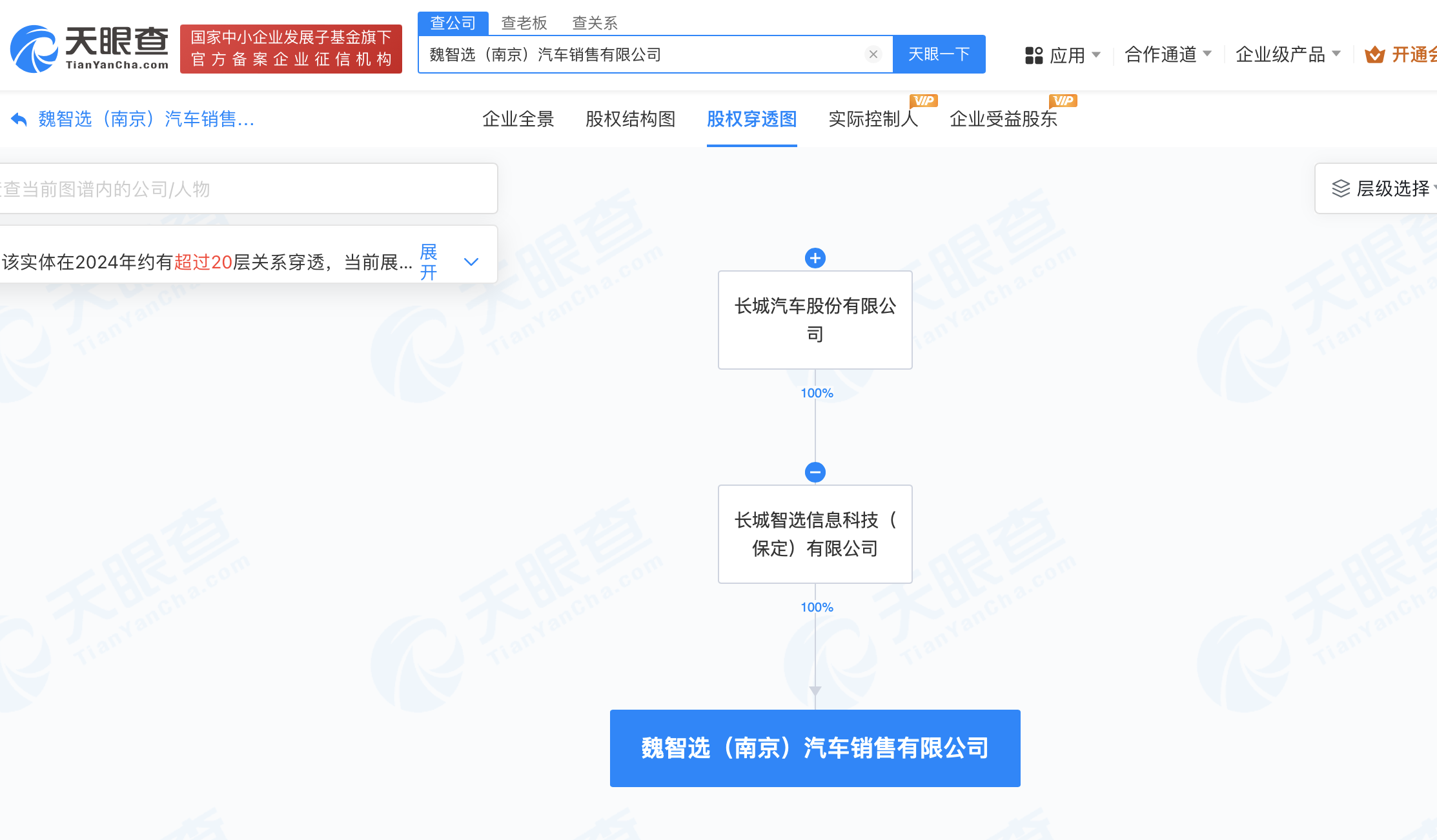 天眼查App显示,近日,魏智选(南京)汽车销售有限公司成立,法定代表人为谭健,注册资本500万人民币,经营范围含汽车销售、摩托车及零配件零售、汽车零配件零售、二手车经纪等。股权全景穿透图显示,该公司由长城智选信息科技(保定)有限公司全资持股,后者为长城汽车(601633)全资子公司。