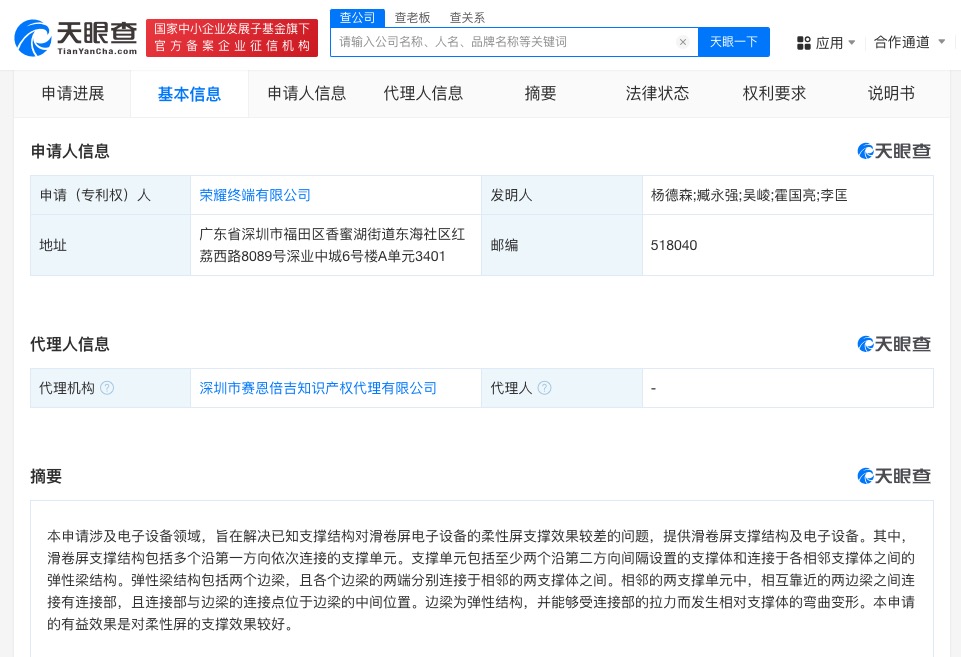 天眼查知识产权信息显示,近日,荣耀终端有限公司申请的“滑卷屏支撑结构及电子设备”专利获授权。