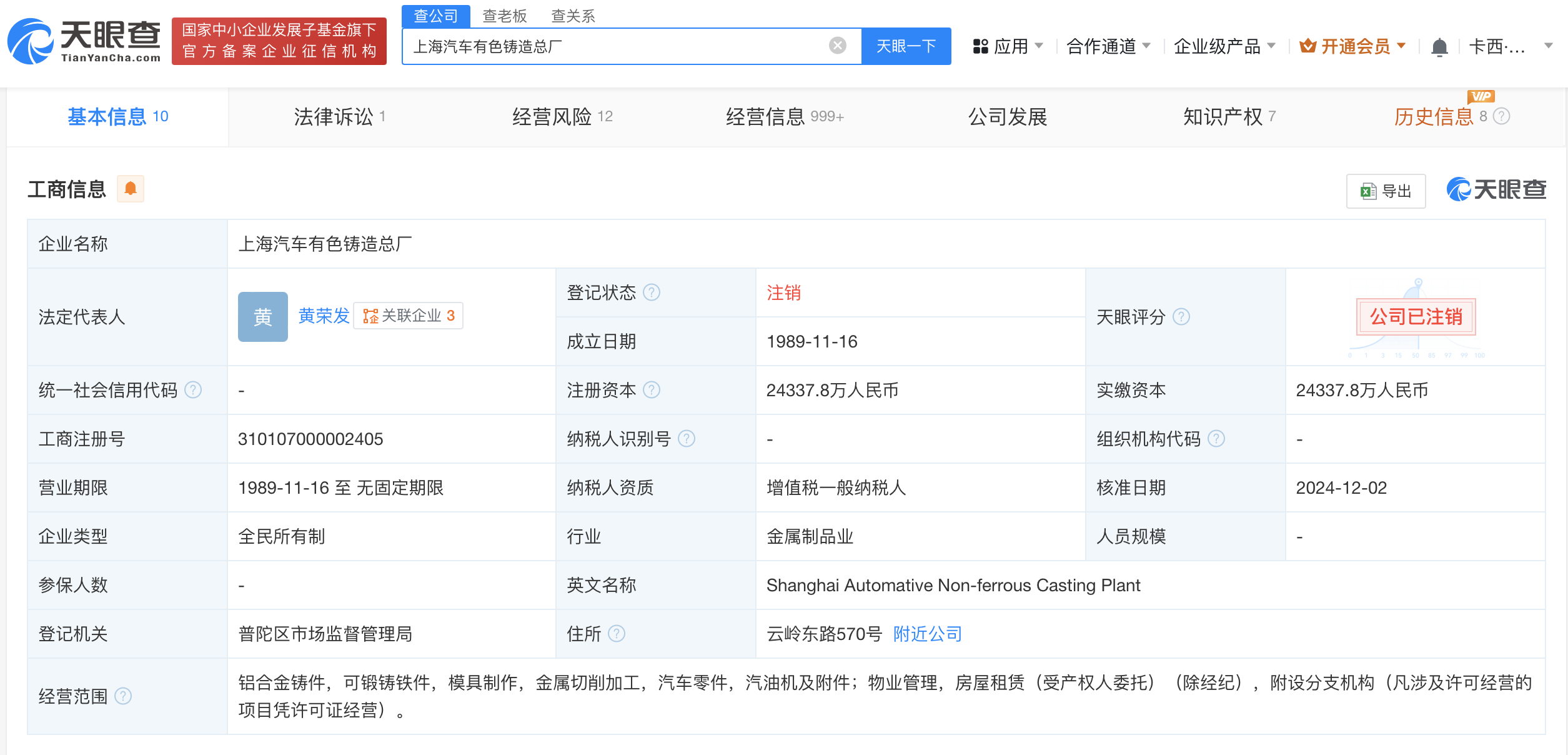 天眼查App显示,近日,上海汽车有色铸造总厂经营状态由存续变更为注销。
