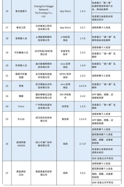 12月3日,据央视新闻消息,工业和信息化部(以下简称“工信部”)在近期组织的第三方检测机构抽查过程中,共发现27款APP及SDK存在侵害用户权益行为,主要集中在信息窗口关不掉、乱跳转,违规收集个人信息以及过度索取权限等问题。工信部要求相关App开发者限期整改,对于整改落实不到位的,将采取企业约谈、App下架、行政处罚等措施。