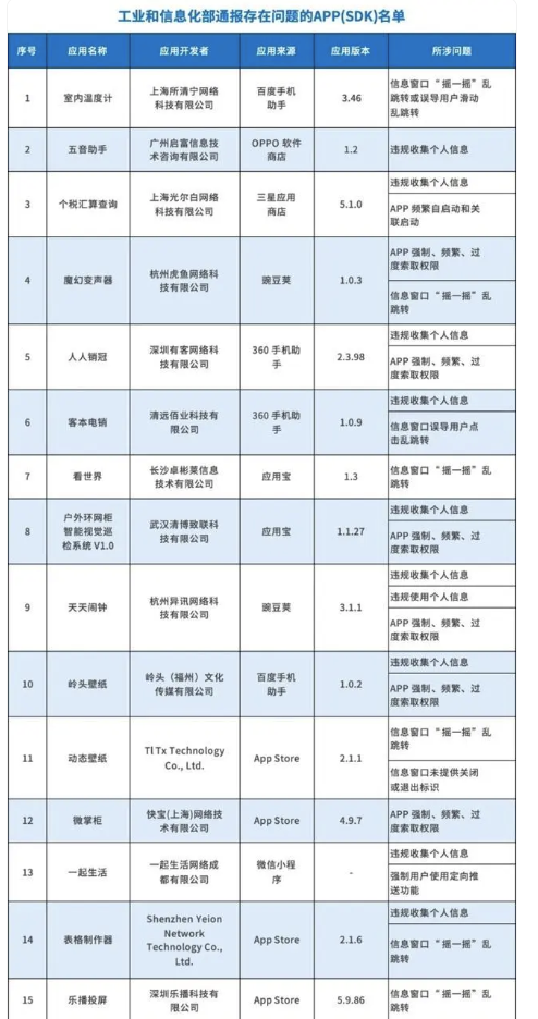 在工信部公布的名单中,“魔幻变声器”“看世界”“动态壁纸”等十余款APP及SDK存在信息窗口“摇一摇”乱跳转或自动乱跳转等相关行为。