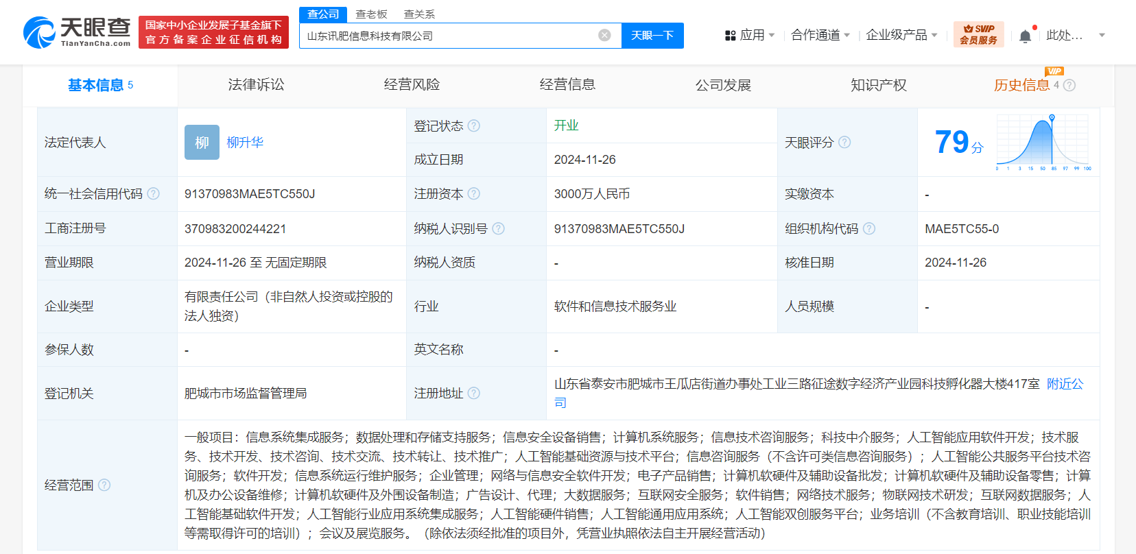 天眼查App显示,近日,山东讯肥信息科技有限公司成立,法定代表人为柳升华,注册资本3000万人民币,经营范围含信息系统集成服务、数据处理和存储支持服务、计算机系统服务、人工智能应用软件开发、人工智能基础资源与技术平台、信息咨询服务、网络与信息安全软件开发等。股权全景穿透图显示,该公司由泉讯人工智能(山东)有限公司全资持股,后者为科大讯飞(002230)全资子公司。