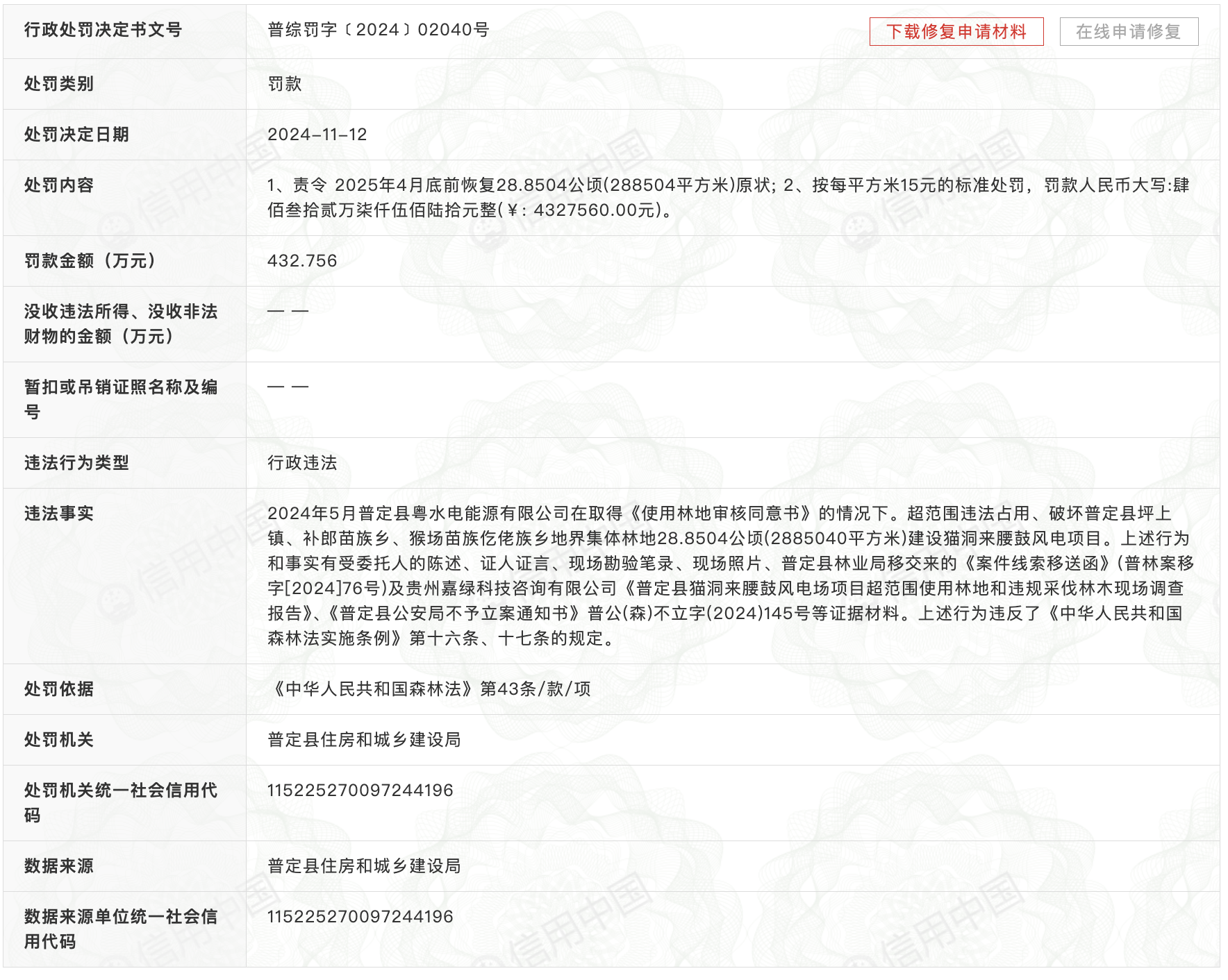 据信用中国显示,11月12日,贵州省安顺市普定县住房和城乡建设局公布《行政处罚决定书》(普综罚字﹝2024﹞02040号)显示,2024年5月普定县粤水电能源有限公司在取得《使用林地审核同意书》的情况下,超范围违法占用、破坏普定县坪上镇、补郎苗族乡、猴场苗族仡佬族乡地界集体林地28.8504公顷(2885040平方米)建设猫洞来腰鼓风电项目。