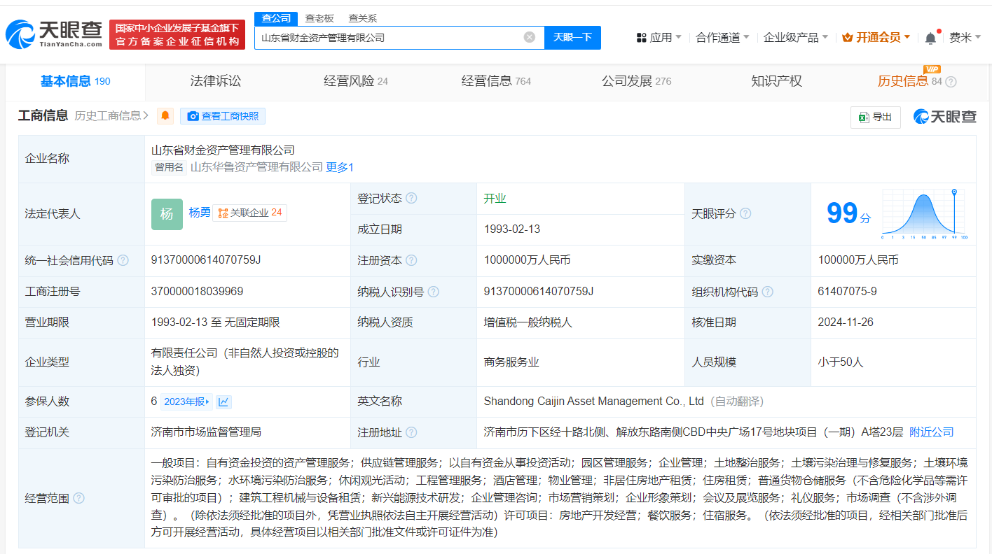 天眼查App显示,近日,山东省财金资产管理有限公司发生工商变更,注册资本由50亿人民币增至100亿人民币,增幅100%。