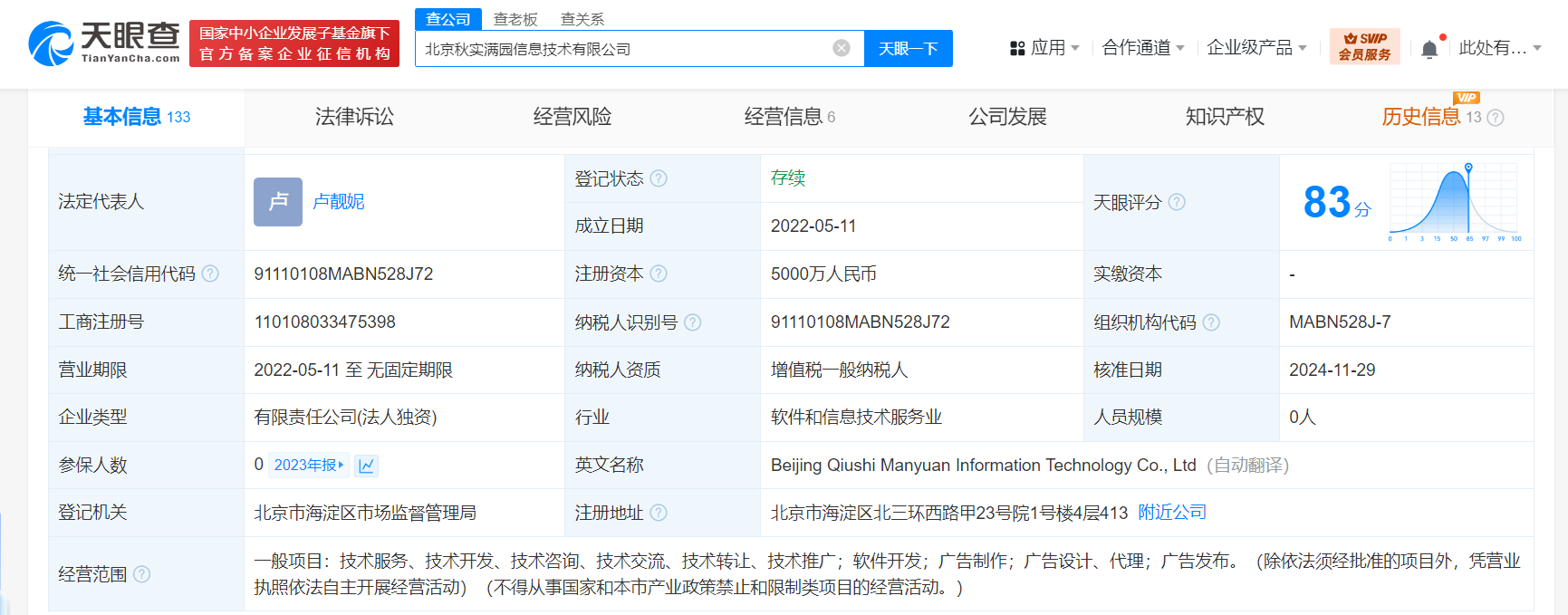 北京秋实满园信息技术有限公司成立于2022年5月,法定代表人为卢靓妮,经营范围为技术服务、技术开发、技术咨询、技术交流、技术转让、技术推广,软件开发,广告制作,广告设计、代理,广告发布。