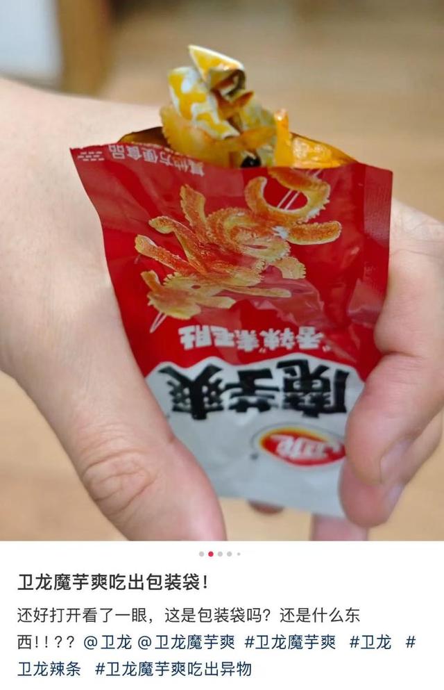 “我是在线上平台购买的,异物看着应该是包装袋,但不知道是什么东西的包装袋。”李爽称,其于8月份购买了一盒卫龙魔芋爽,但于12月1日吃出了异物,目前已向卫龙客服反映。