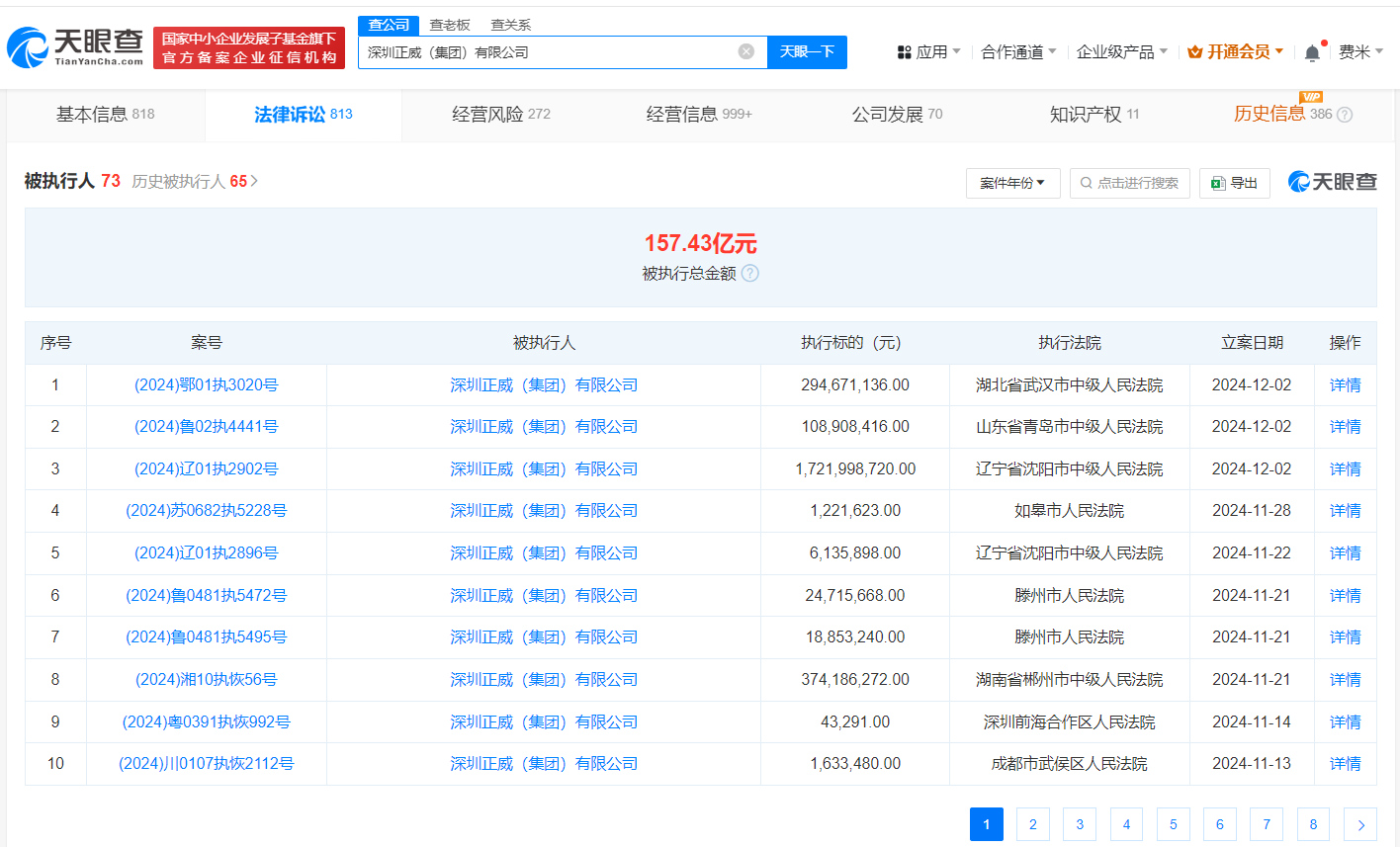 天眼风险信息显示,深圳正威(集团)有限公司现存70余条被执行人信息,被执行总金额超157亿元。此外,该公司还存在多条限制消费令、失信被执行人(老赖)和终本案件信息。
