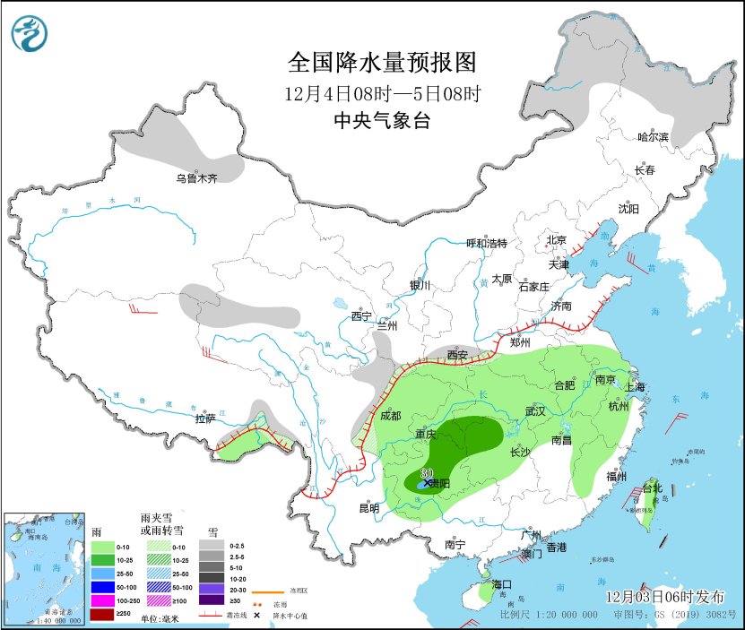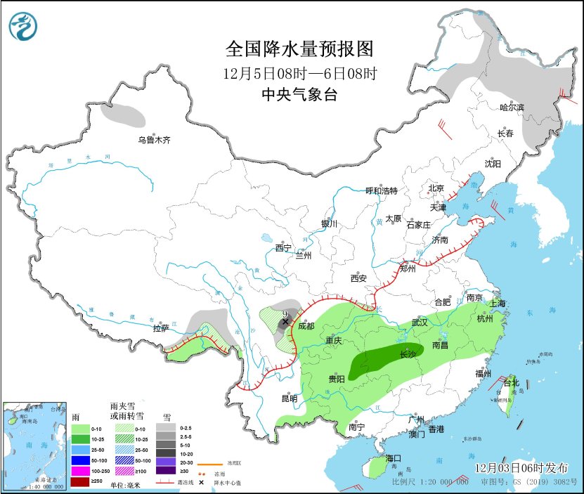 12月4日08时至5日08时,内蒙古东北部、黑龙江大部、新疆北部和沿天山地区、西藏东南部、青海西部、川西高原北部、陕西南部等地部分地区有小雪或雨夹雪。西北地区东南部、黄淮西部、江淮大部、江汉、江南大部、西南地区东部、广西西北部、海南岛、台湾岛大部等地部分地区有小到中雨,其中,贵州南部等地部分地区有大雨(25~30毫米)。西藏北部部分地区有4~6级风(见图2)。