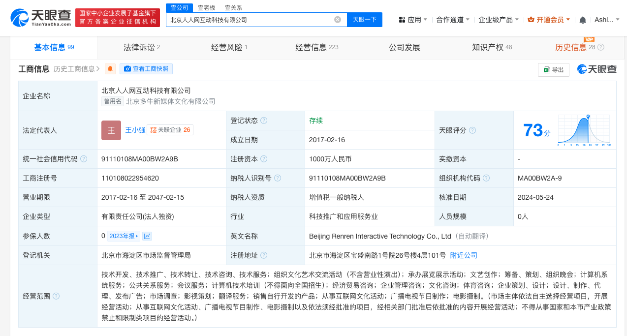 天眼查App显示,人人网关联公司北京人人网互动科技有限公司成立于2017年2月,法定代表人为王小强,注册资本1000万人民币,登记状态为存续,经营范围含从事互联网文化活动、广播电视节目制作、电影摄制等,由成都鹰飞尼特斯网络技术有限公司全资持股。