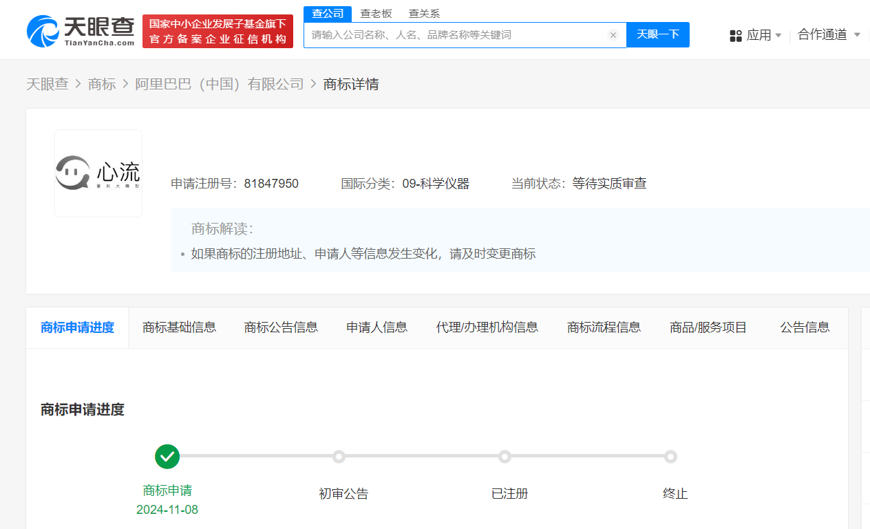 天眼查知识产权信息显示,近日,阿里巴巴(中国)有限公司申请注册“心流星辰大模型”图形商标,国际分类为科学仪器,当前商标状态为等待实质审查。