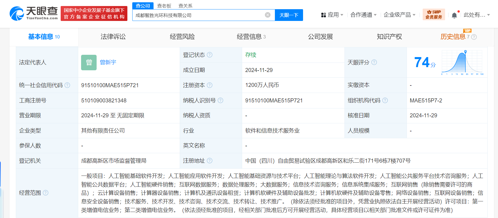 公司成立,法定代表人为曾新宇,注册资本1200万人民币,经营范围含人工智能基础软件开发、人工智能应用软件开发、人工智能基础资源与技术平台、人工智能理论与算法软件开发、互联网数据服务、数据处理服务、大数据服务、信息技术咨询服务、信息系统集成服务、互联网销售等。股东信息显示,该公司由川大智胜(002253)、光环云(上海)数据科技有限公司、共青城光环壹号投资合伙企业(有限合伙)共同持股。
