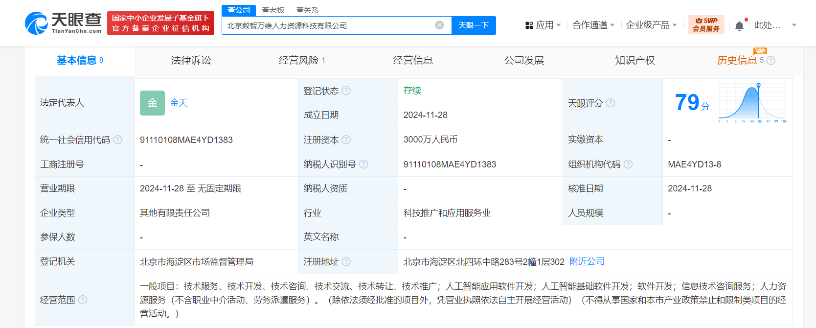 天眼查App显示,近日,北京数智万维人力资源科技有限公司成立,法定代表人为金天,注册资本3000万人民币,经营范围为技术服务、技术开发、技术咨询、技术交流、技术转让、技术推广,人工智能应用软件开发,人工智能基础软件开发,软件开发,信息技术咨询服务,人力资源服务。股东信息显示,该公司由北京外企数字科技有限公司、昆仑万维(300418)、金天共同持股。
