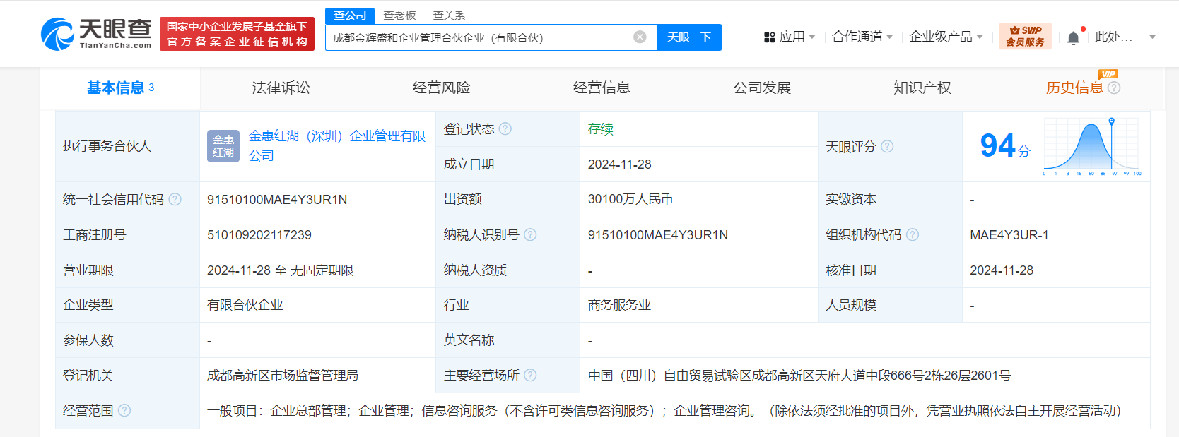 天眼查App显示,近日,成都金辉盛和企业管理合伙企业(有限合伙)成立,执行事务合伙人为金惠红湖(深圳)企业管理有限公司,出资额3.01亿人民币,经营范围为企业总部管理、企业管理、信息咨询服务、企业管理咨询。合伙人信息显示,该企业由深圳市华迅康科技有限公司以及泸州老窖旗下金惠红湖(深圳)企业管理有限公司、四川金舵投资有限责任公司共同出资。