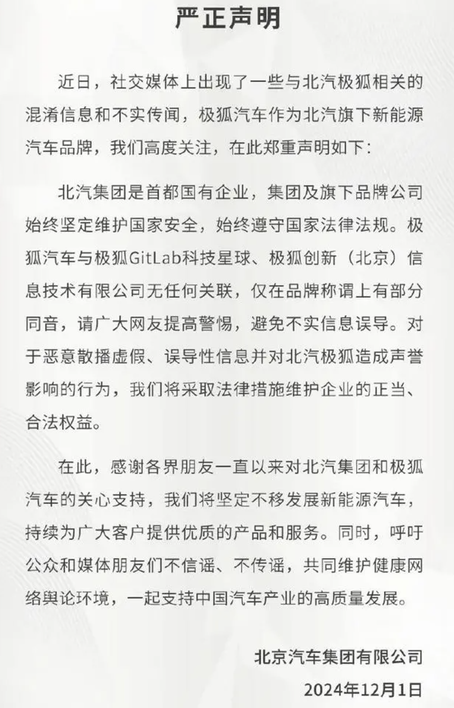 12月1日晚,北汽集团发布严正声明:对极狐汽车造成声誉影响的行为,将采取法律措施维护权益。