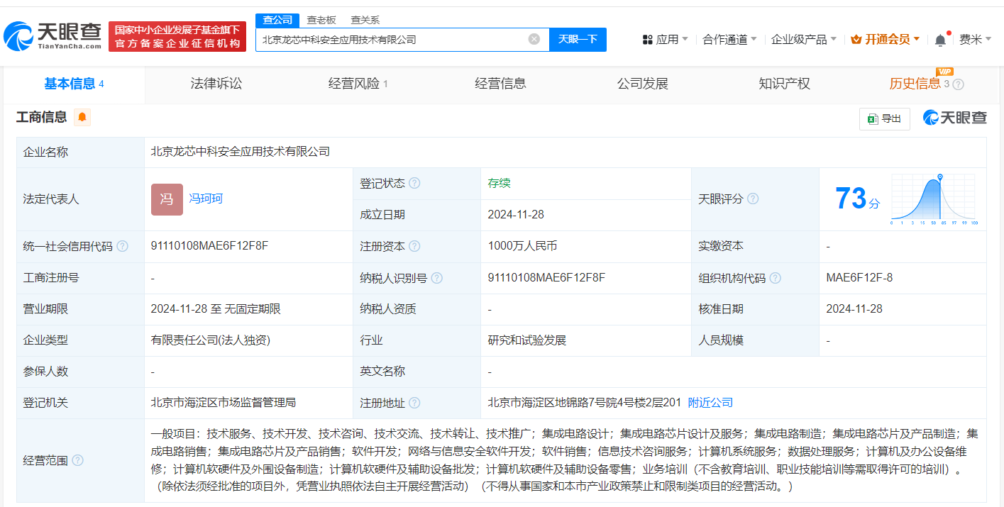 天眼查App显示,近日,北京龙芯中科安全应用技术有限公司成立,法定代表人为冯珂珂,注册资本1000万人民币,经营范围含集成电路设计、集成电路制造、集成电路销售、网络与信息安全软件开发、软件销售、信息技术咨询服务等,由龙芯中科(688047)全资持股。