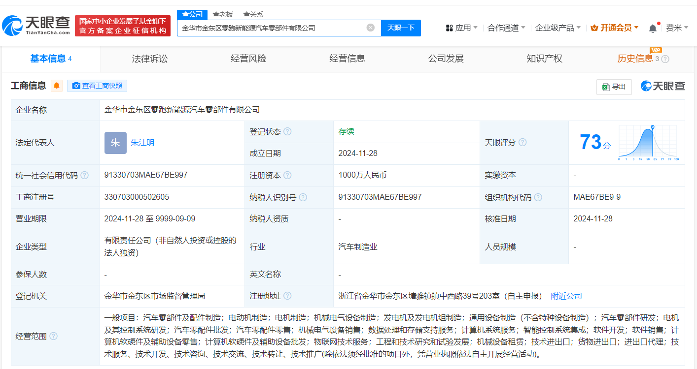 天眼查App显示,近日,金华市金东区零跑新能源汽车零部件有限公司成立,法定代表人为朱江明,注册资本1000万人民币,经营范围含汽车零部件及配件制造、电动机制造、发电机及发电机组制造、汽车零部件研发、数据处理和存储支持服务、智能控制系统集成等,由零跑汽车(HK.09863)全资持股。