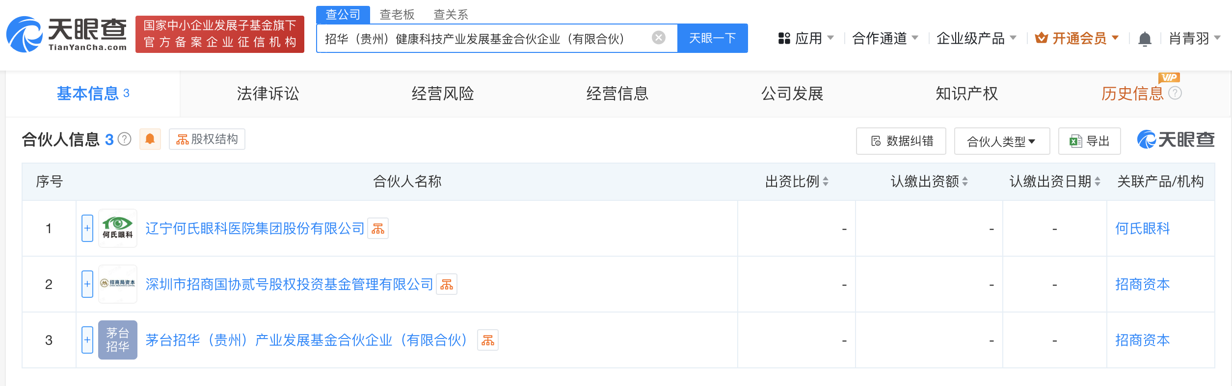 天眼查App显示,近日,招华(贵州)健康科技产业发展基金合伙企业(有限合伙)成立,执行事务合伙人为深圳市招商国协贰号股权投资基金管理有限公司,出资额7.97亿人民币,经营范围为以私募基金从事股权投资、投资管理、资产管理等活动。合伙人信息显示,该企业由何氏眼科(301103)、深圳市招商国协贰号股权投资基金管理有限公司、茅台招华(贵州)产业发展基金合伙企业(有限合伙)共同出资。