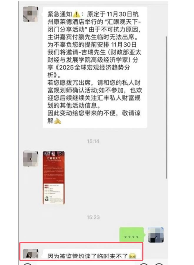 付鹏在朋友圈晒出的汇丰方面人员与客户的聊天截图显示,汇丰工作人员称,“原定于11月30日杭州康莱德酒店举行的‘汇眼观天下闭门分享活动’由于不可抗力原因,主讲嘉宾付鹏先生临时无法出席。为不辜负您的提前安排,11月30日将邀请另一位专家分享。若您愿拨冗出席,请和您的私人财富规划师确认活动;如不参加,也欢迎您后续继续关注汇丰私人财富规划的其他活动信息。”