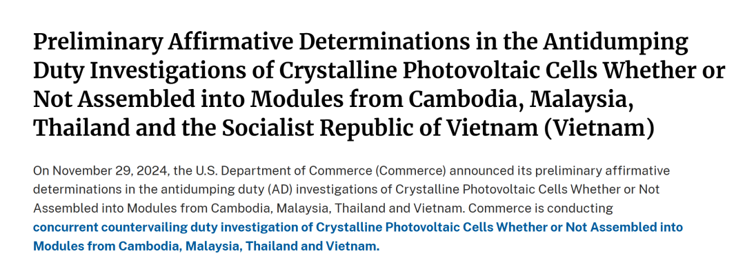 当地时间11月29日,美国商务部公布其对东南亚四国柬埔寨、马来西亚、泰国和越南晶体光伏电池(无论是否组装成组件)反倾销税调查的初步肯定性裁定:四国反倾销税率范围在0—271.28%。但最终结果将在2025年年中公布。