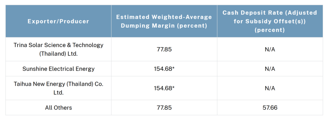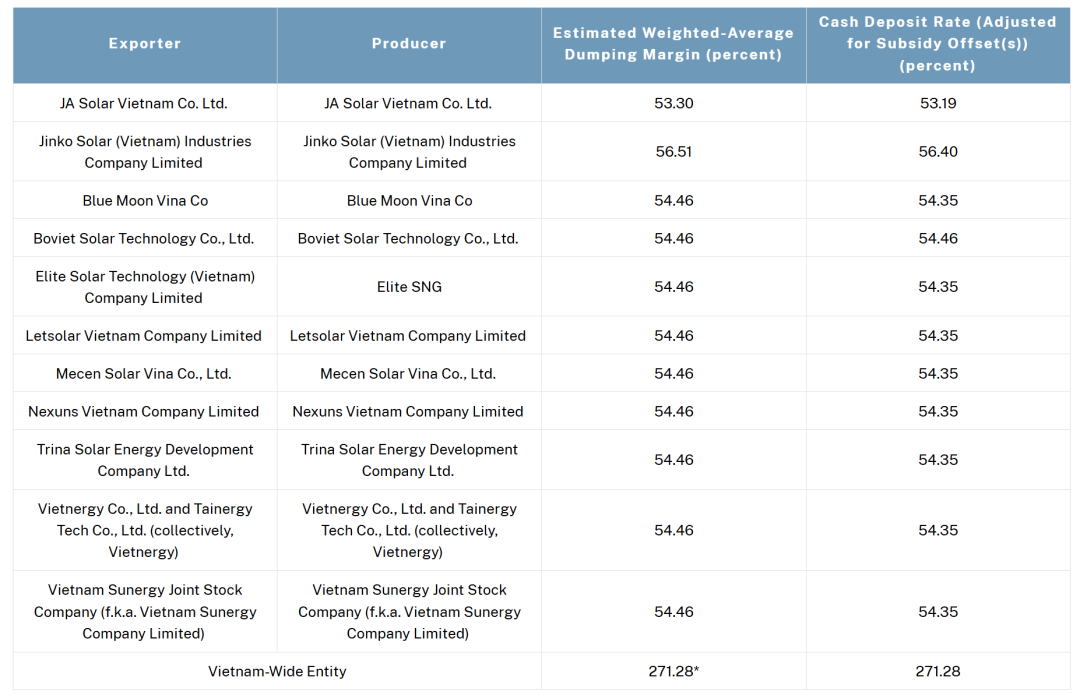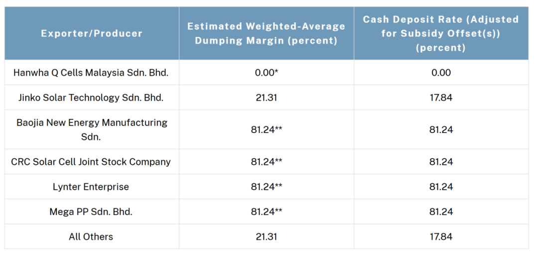 从此次发布的公告看,美国商务部对东南亚四国的电池光伏企业反倾销税率范围在0—271.28%。其中,韩华Hanwha Qcell马来西亚反倾销税率为0,Vietnam-Wide Entity越南反倾销税率为271.28%。