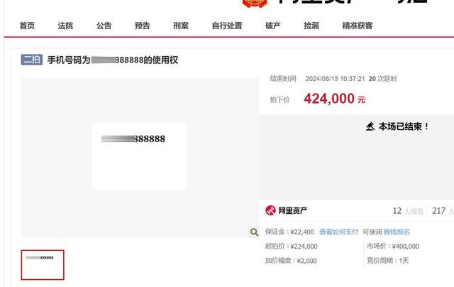 据媒体公开报道:盐城市亭湖区人民法院在执行一起涉及某公司与多家企业及个人的买卖合同纠纷案件中,面临执行难题,被执行人名下无可供执行的财产。然而,执行法官发现被执行人之一持有的尾号“888888”手机号具有潜在市场价值。法院迅速行动,联系运营商核实信息,并启动了查封与拍卖程序。最终该手机号被人以42.4万元的最高价竞得。