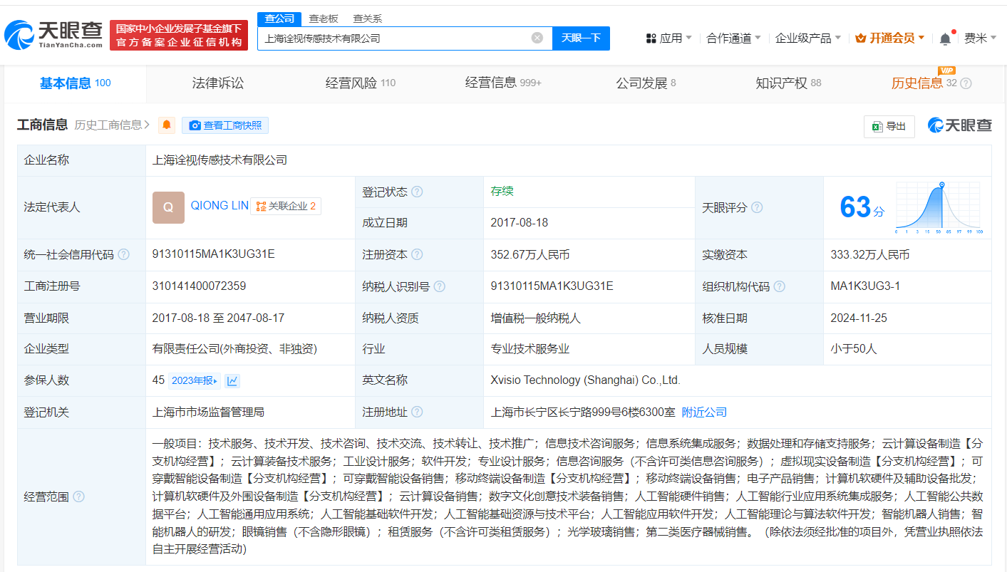 上海诠视传感技术有限公司成立于2017年8月,法定代表人为QIONG LIN,经营范围含信息技术咨询服务、信息系统集成服务、数据处理和存储支持服务、云计算装备技术服务、工业设计服务、软件开发等,现由希亚思(上海)股权投资基金合伙企业(有限合伙)、上海锐合雄星创业投资中心(有限合伙)等及上述新增股东共同持股。