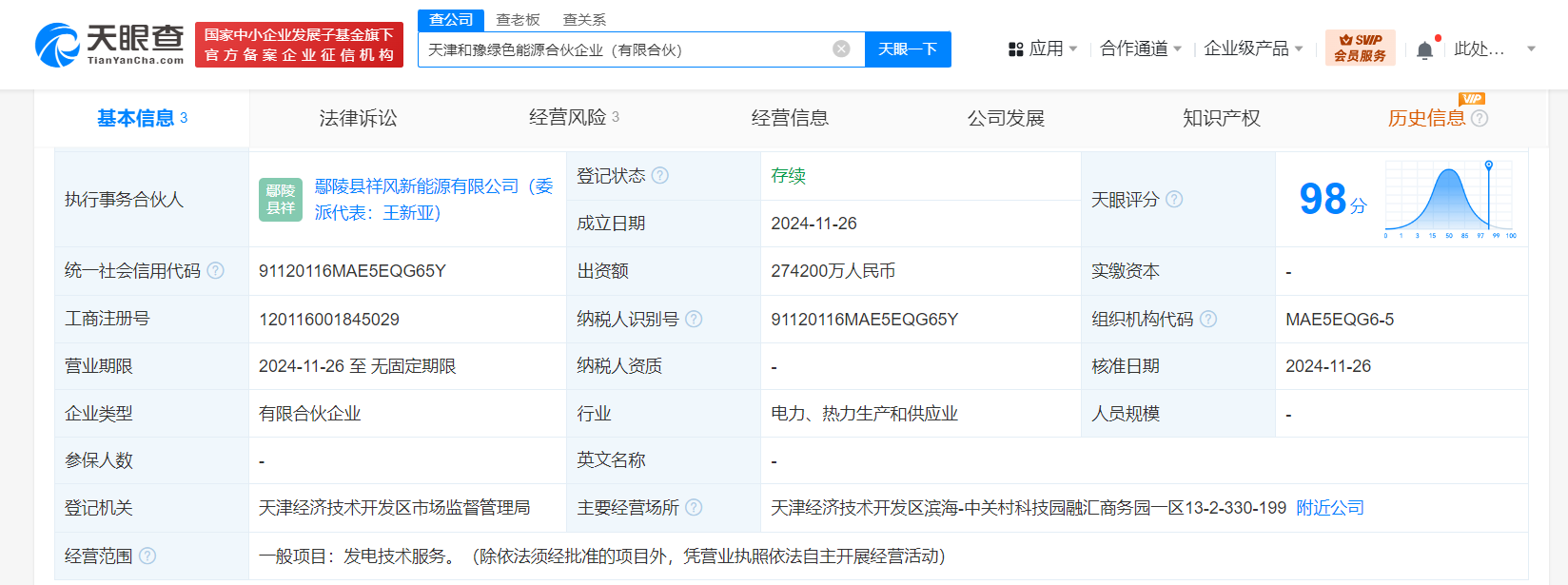 天眼查App显示,近日,天津和豫绿色能源合伙企业(有限合伙)成立,执行事务合伙人为鄢陵县祥风新能源有限公司,出资额27.42亿人民币,经营范围为发电技术服务。合伙人信息显示,该企业由中国康富(833499)、国电投河南新能源有限公司及旗下鄢陵县祥风新能源有限公司共同出资。