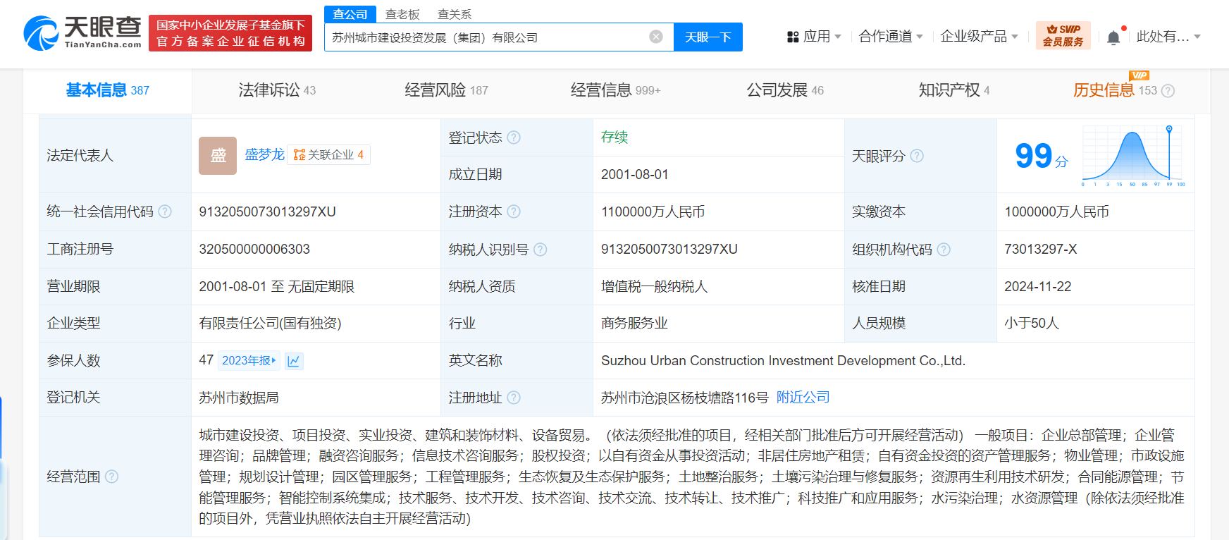 苏州城市建设投资发展(集团)有限公司成立于2001年8月,法定代表人为盛梦龙。