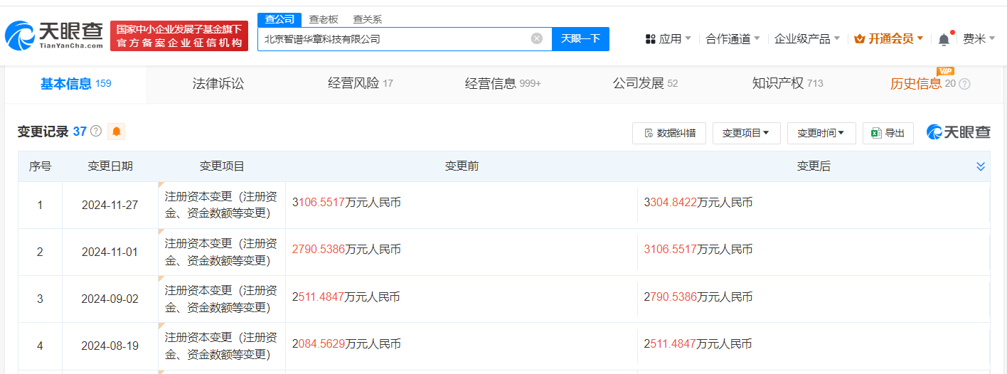 天眼查App显示,近日,智谱AI关联公司北京智谱华章科技有限公司发生工商变更,注册资本由约3106.6万人民币增至约3304.8万人民币。