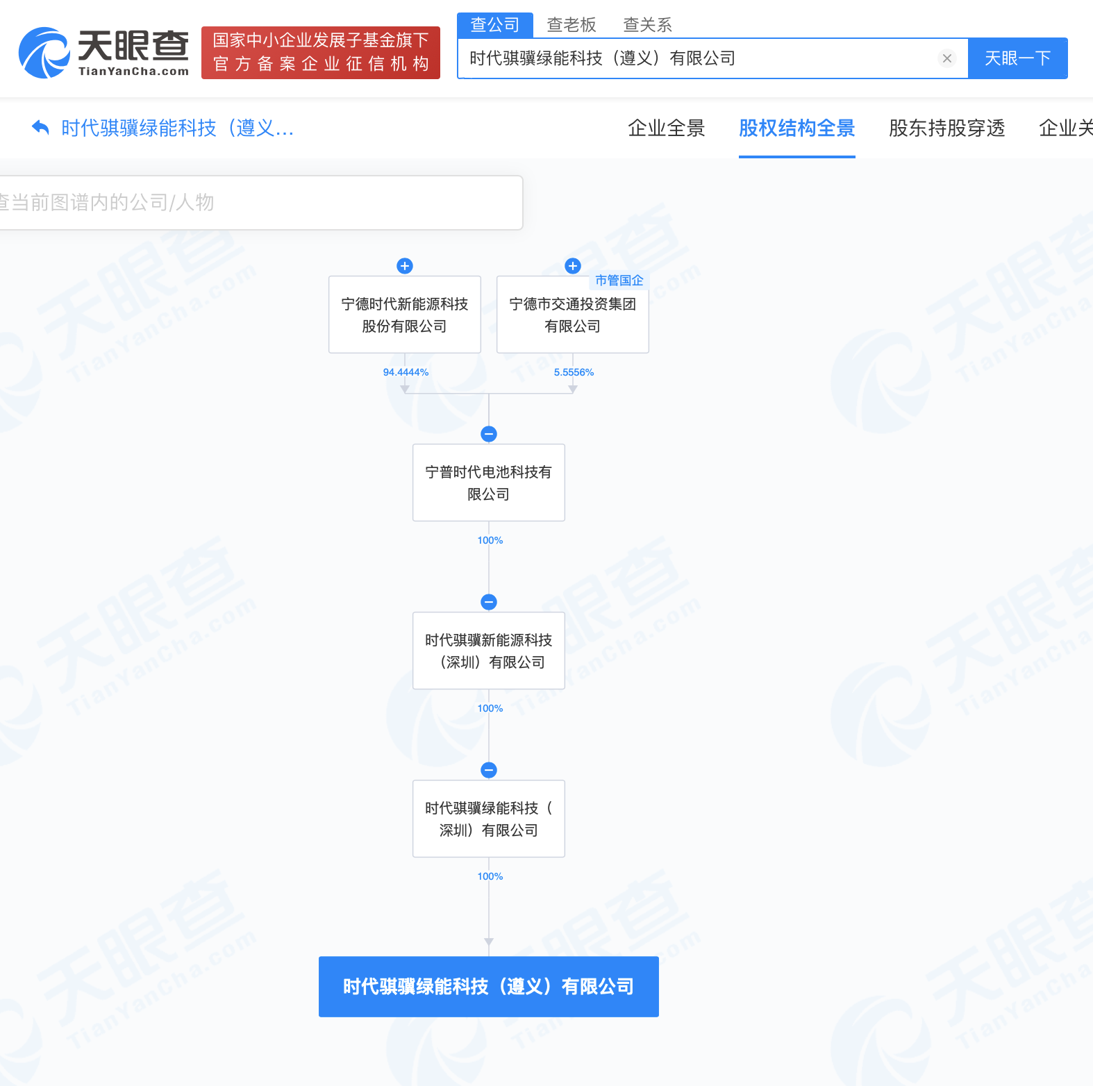 天眼查App显示,近日,时代骐骥绿能科技(遵义)有限公司成立,法定代表人为郭志强,注册资本500万人民币,经营范围含新兴能源技术研发、新能源汽车换电设施销售、新能源汽车电附件销售、新能源汽车整车销售、汽车零部件研发等。股权全景穿透图显示,该公司由时代骐骥绿能科技(深圳)有限公司全资持股,后者为宁德时代(300750)旗下时代骐骥新能源科技(深圳)有限公司全资子公司。