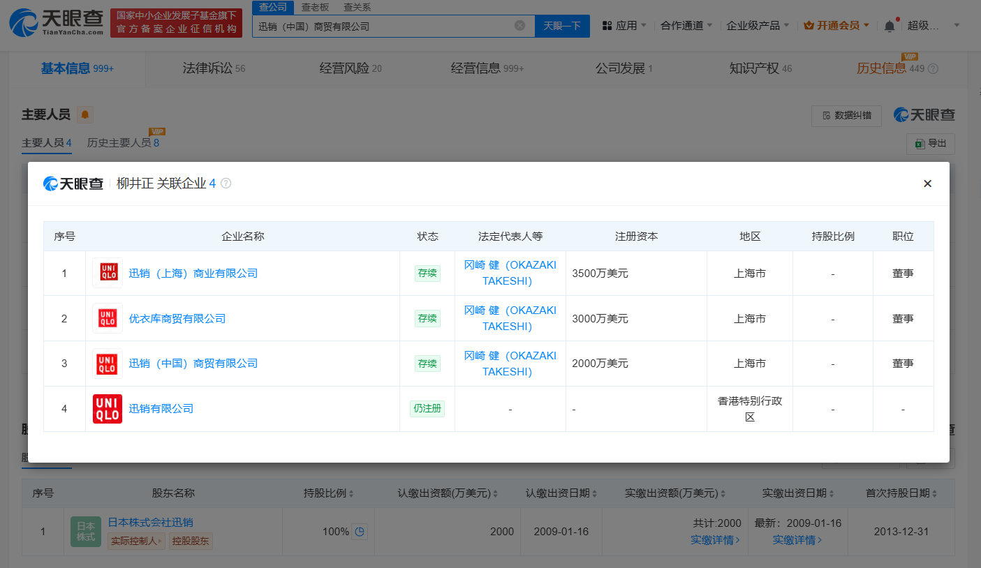 此外,优衣库关联迅销(上海)商业有限公司成立于2012年10月,注册资本3500万美元,拥有20余家分支机构;优衣库商贸有限公司成立于2010年3月,注册资本3000万美元,拥有50余家分支机构。值得注意的是,柳井正均在上述公司担任董事。