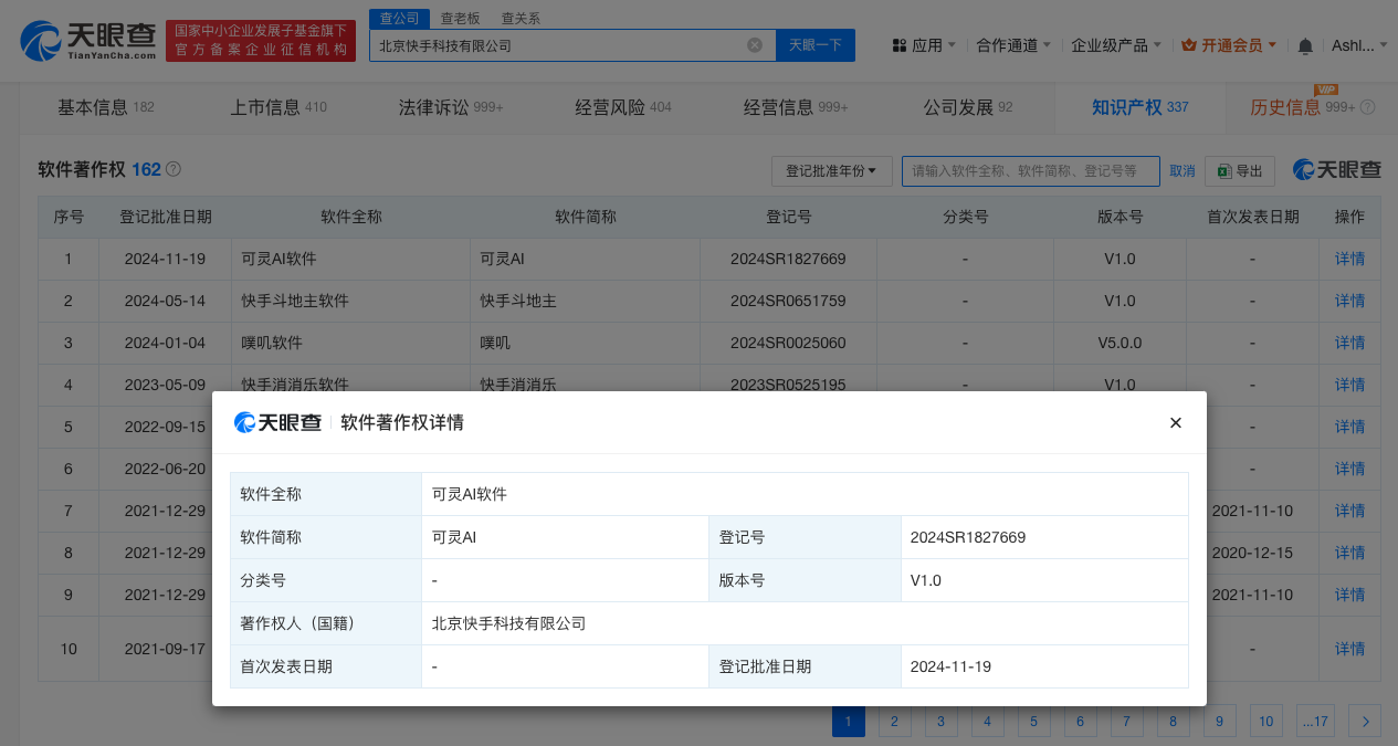 天眼查知识产权信息显示,近日,北京快手科技有限公司“可灵AI”软件著作权获得登记批准,版本号为V1.0。公开资料显示,可灵AI是由快手大模型团队自研打造的视觉生成大模型,具备强大的视觉生成能力,可让用户可以轻松高效地完成各种艺术创作。