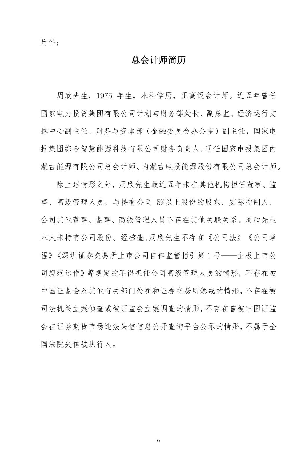 周欣先生,1975年生,本科学历,正高级会计师。近五年曾任国家电力投资集团有限公司计划与财务部处长、副总监、经济运行支撑中心副主任、财务与资本部(金融委员会办公室)副主任,国家电投集团综合智慧能源科技有限公司财务负责人。现任国家电投集团内蒙古能源有限公司总会计师、内蒙古电投能源股份有限公司总会计师。