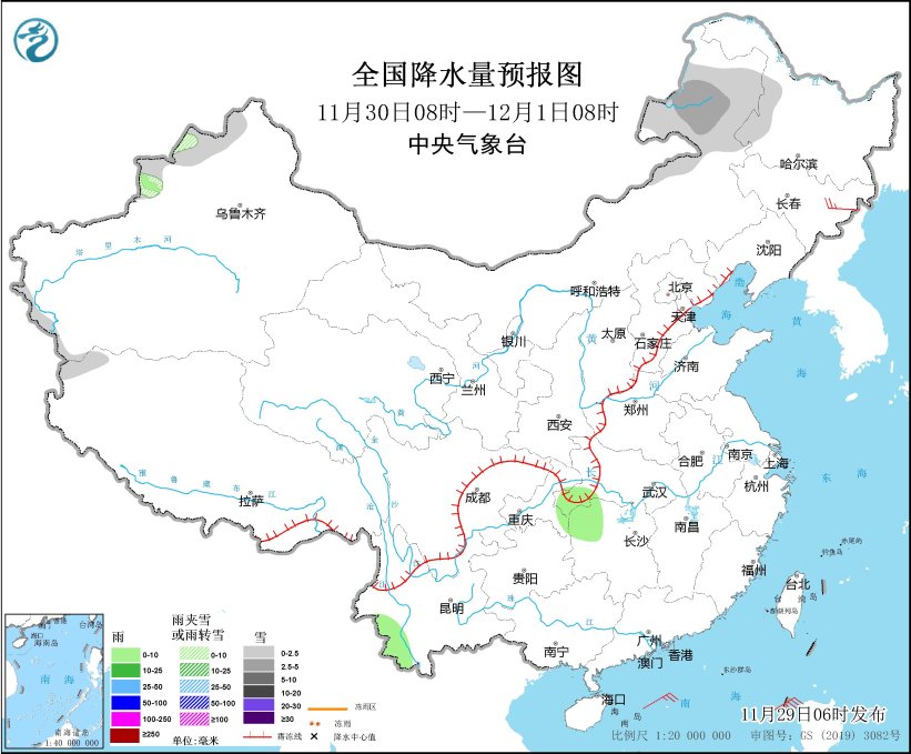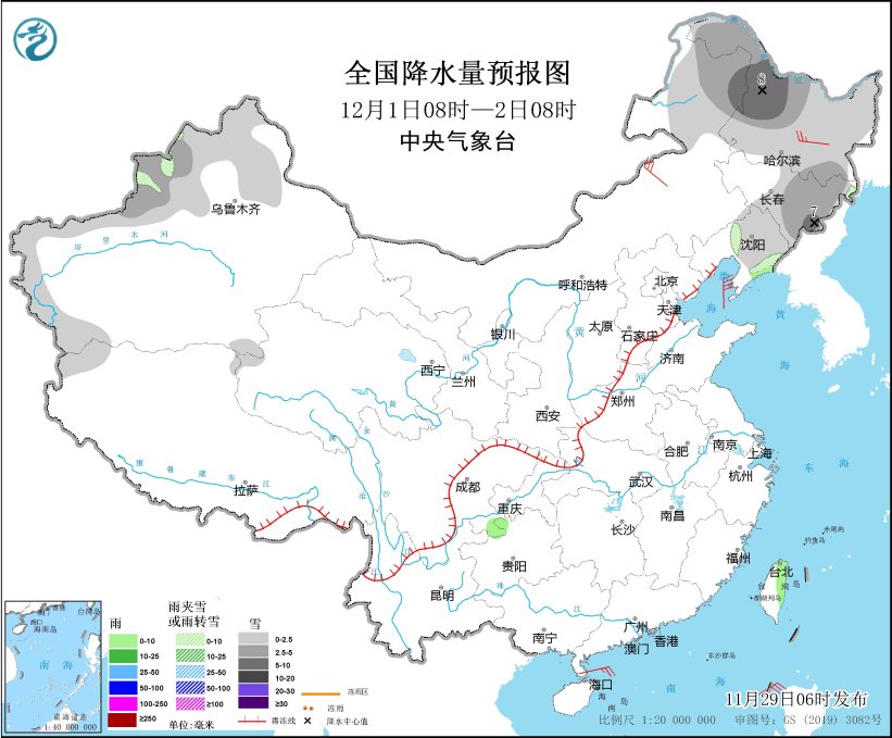 11月30日08时至12月1日08时,内蒙古东部、黑龙江西部、新疆北疆北部等地部分地区有小雪或雨夹雪,其中,内蒙古东北部部分地区有中雪。湖北南部、湖南北部和西部、重庆东南部、云南西南部等地部分地区有小雨。吉林东部部分地区有4~5级风。