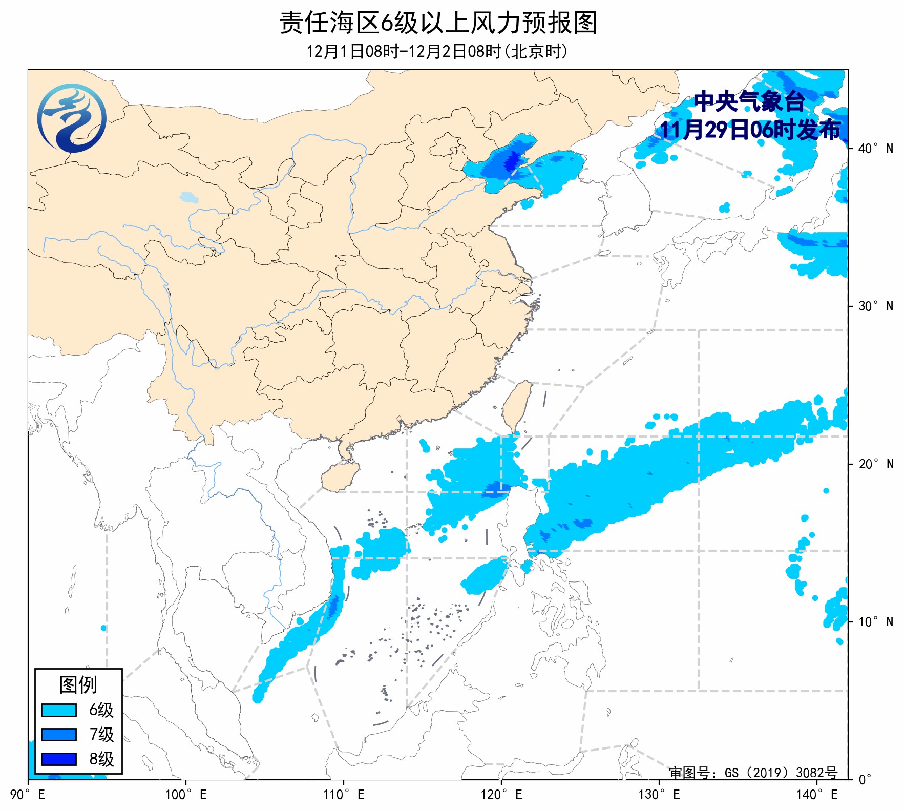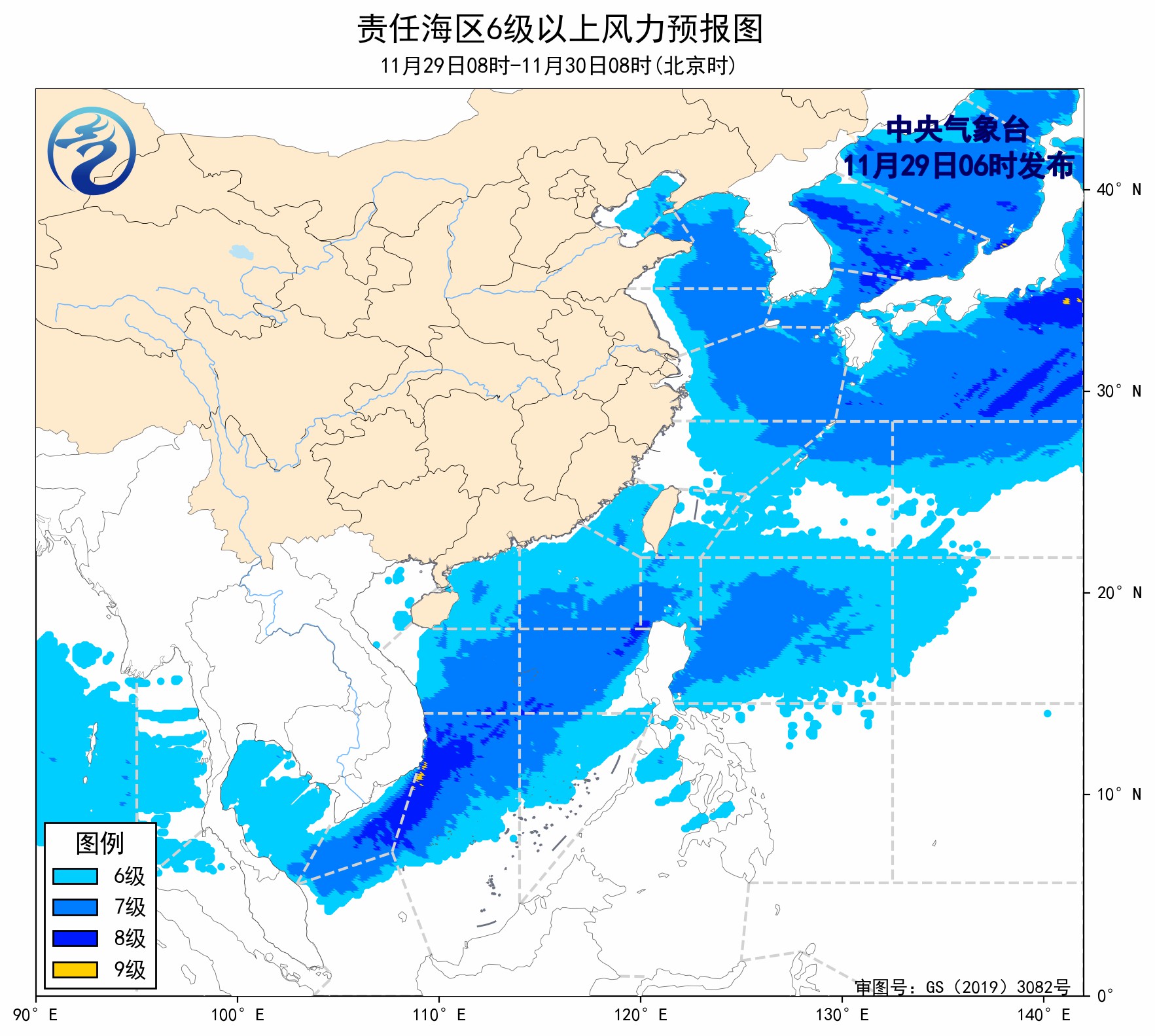 11月28日14时至29日02时,黄海中部和南部海域、东海北部海域出现了7~8级、阵风9级的西北风,渤海、渤海海峡、黄海北部海域出现了5~7级、阵风8级的偏西风或西北风,台湾海峡、南海西北部海域、北部湾出现了5~6级、阵风7级的偏北风,巴士海峡、南海东北部海域、南海中西部和南部海域出现了6~8级、阵风9级的东北风或偏北风。