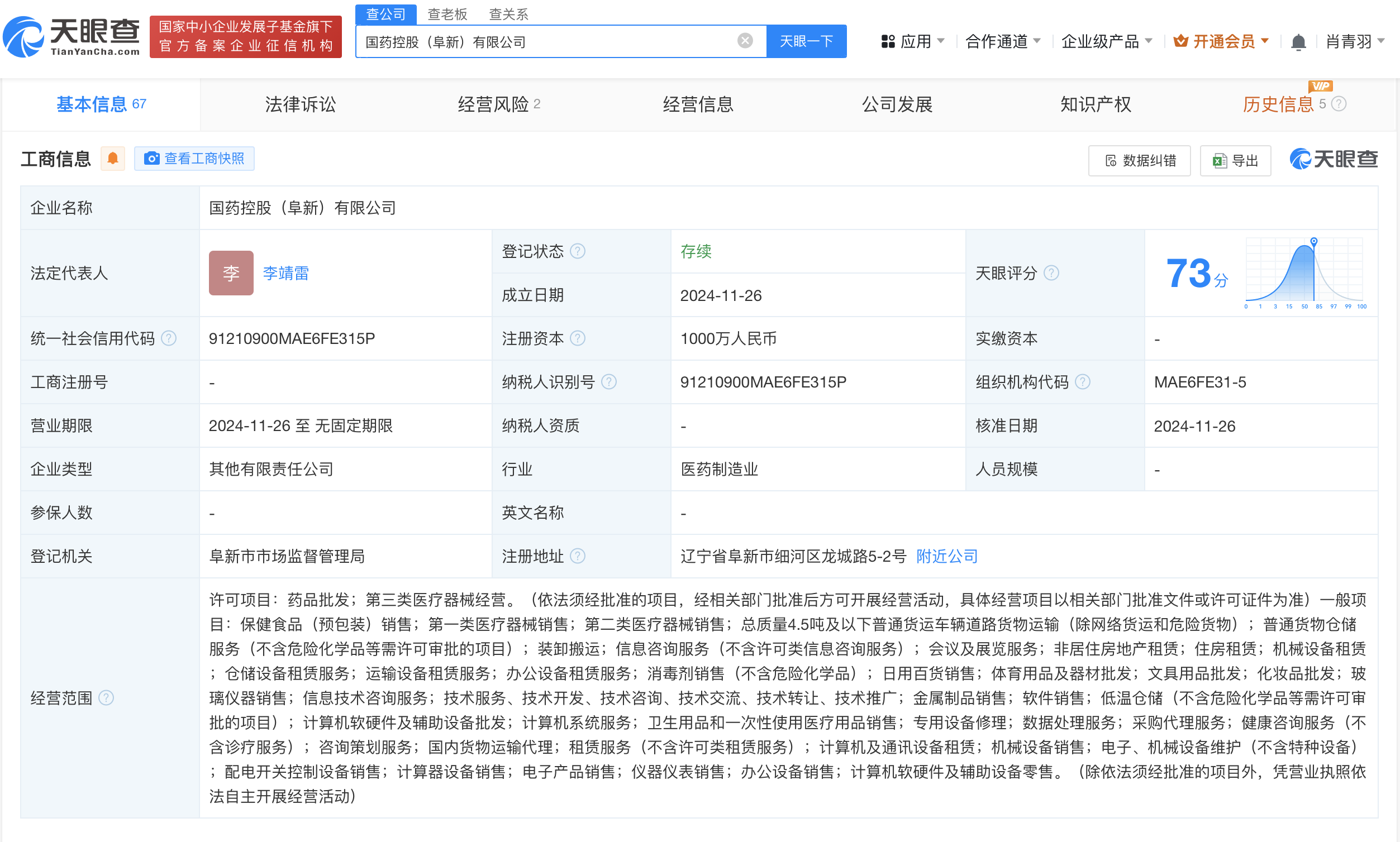 天眼查App显示,近日,国药控股(阜新)有限公司成立,法定代表人为李靖雷,注册资本1000万人民币,经营范围含药品批发、第三类医疗器械经营、保健食品(预包装)销售、第一类医疗器械销售、第二类医疗器械销售等。股东信息显示,该公司由国药控股(HK.01099)旗下国药控股沈阳有限公司、阜新国有资本投资管理集团有限公司共同持股。