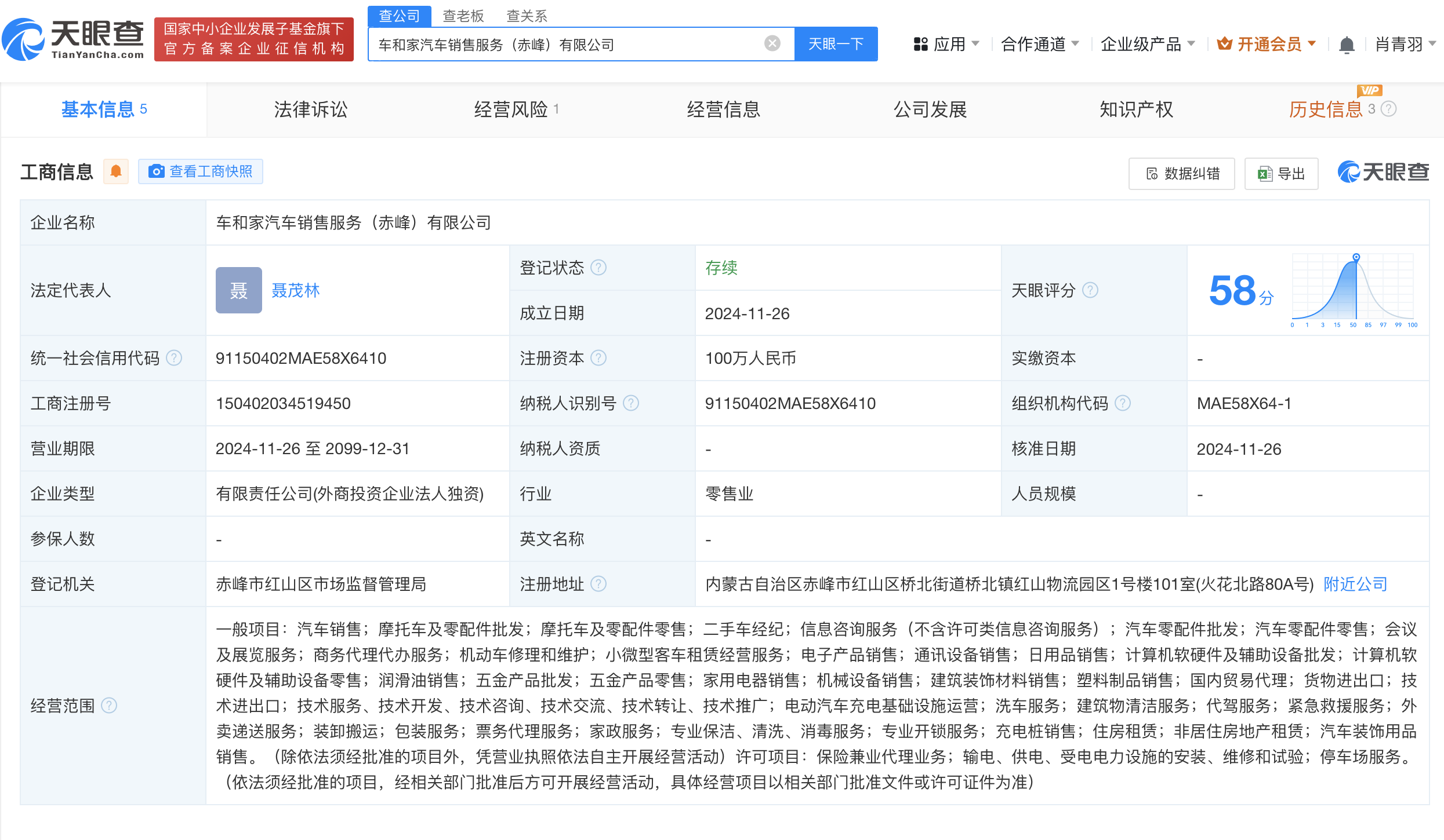 天眼查App显示,近日,车和家汽车销售服务(赤峰)有限公司成立,法定代表人为聂茂林,注册资本100万人民币,经营范围含汽车销售、摩托车及零配件批发、摩托车及零配件零售、二手车经纪、汽车零配件批发、汽车零配件零售等。股权全景穿透图显示,该公司由北京励鼎汽车销售有限公司全资持股,后者为理想汽车旗下Leading Ideal HK Limited全资子公司。