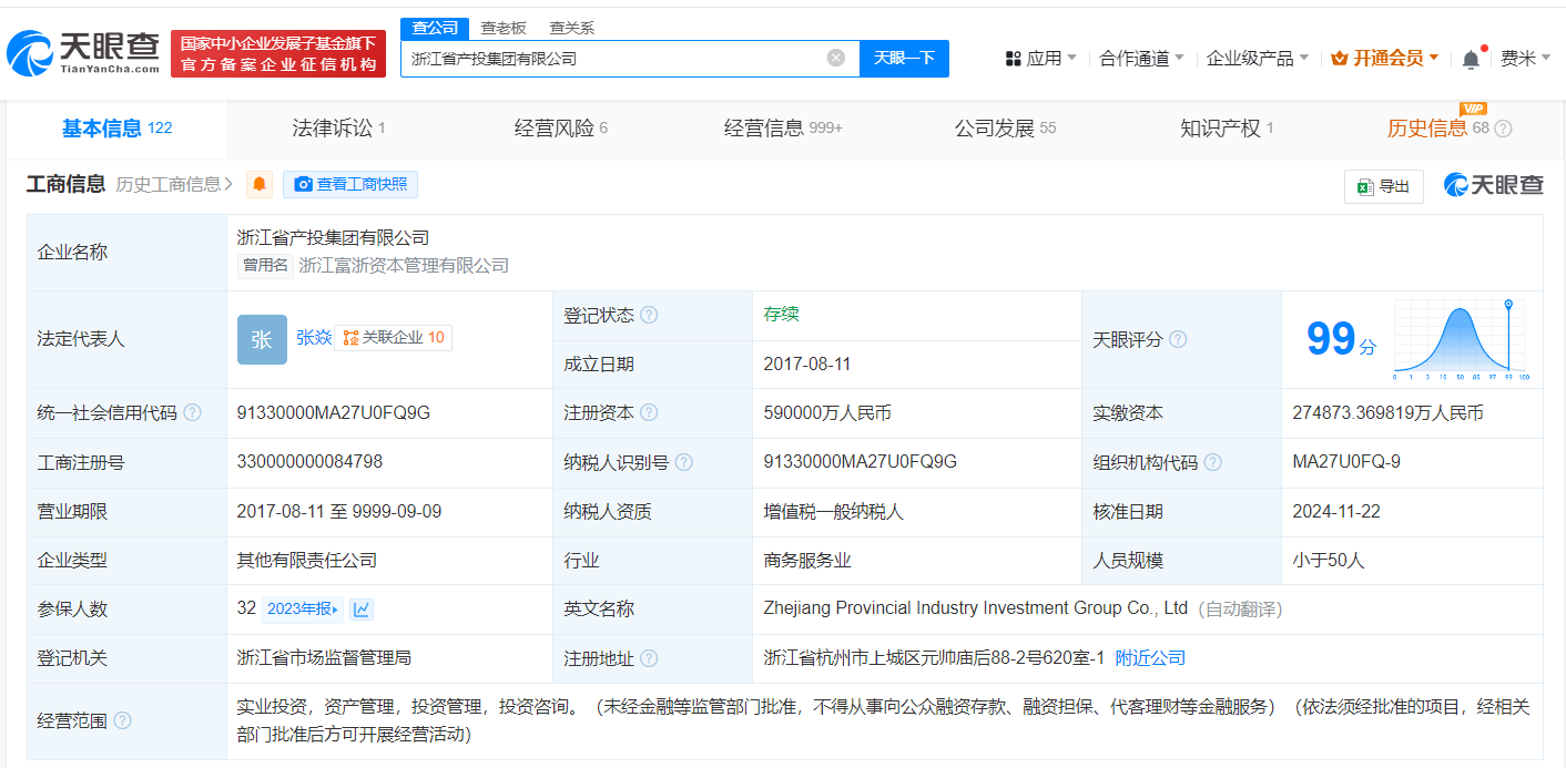 浙江省产投集团有限公司成立于2017年8月,法定代表人为张焱,经营范围为实业投资、资产管理、投资管理、投资咨询,由浙江省国有资本运营有限公司及上述新增股东共同持股。