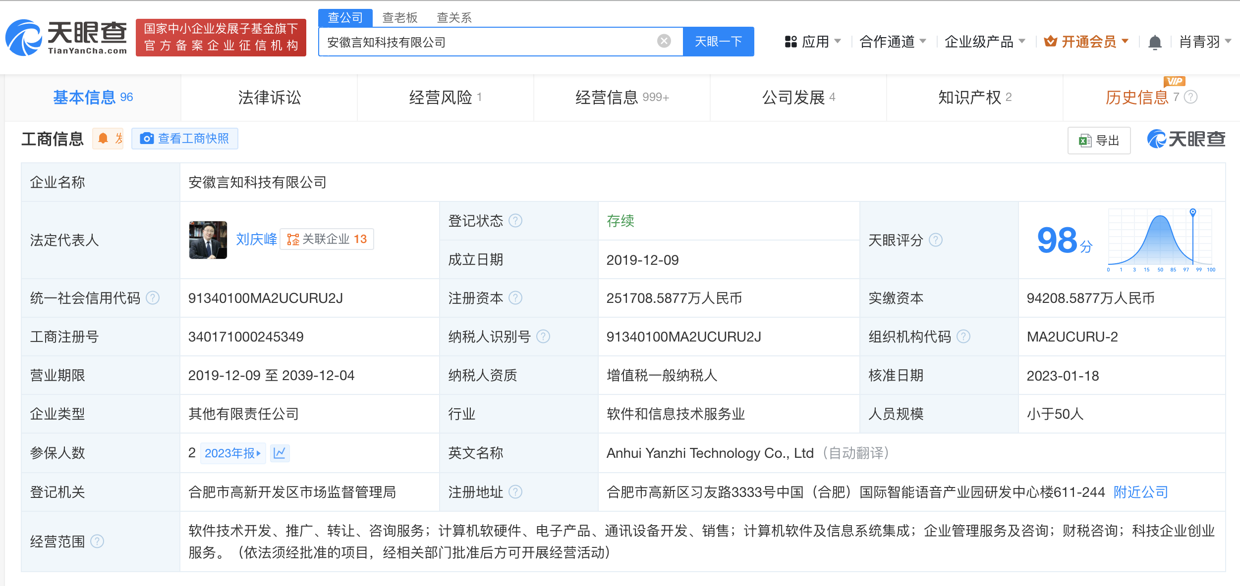 安徽言知科技有限公司成立于2019年12月,法定代表人为刘庆峰,注册资本约25.17亿人民币,经营范围含计算机软硬件、电子产品、通讯设备开发、销售等,由科大讯飞创始人刘庆峰、田明、安徽省三重一创产业发展基金有限公司、合肥市创业投资引导基金有限公司等共同持股。对外投资信息显示,该公司为科大讯飞(002230)股东。