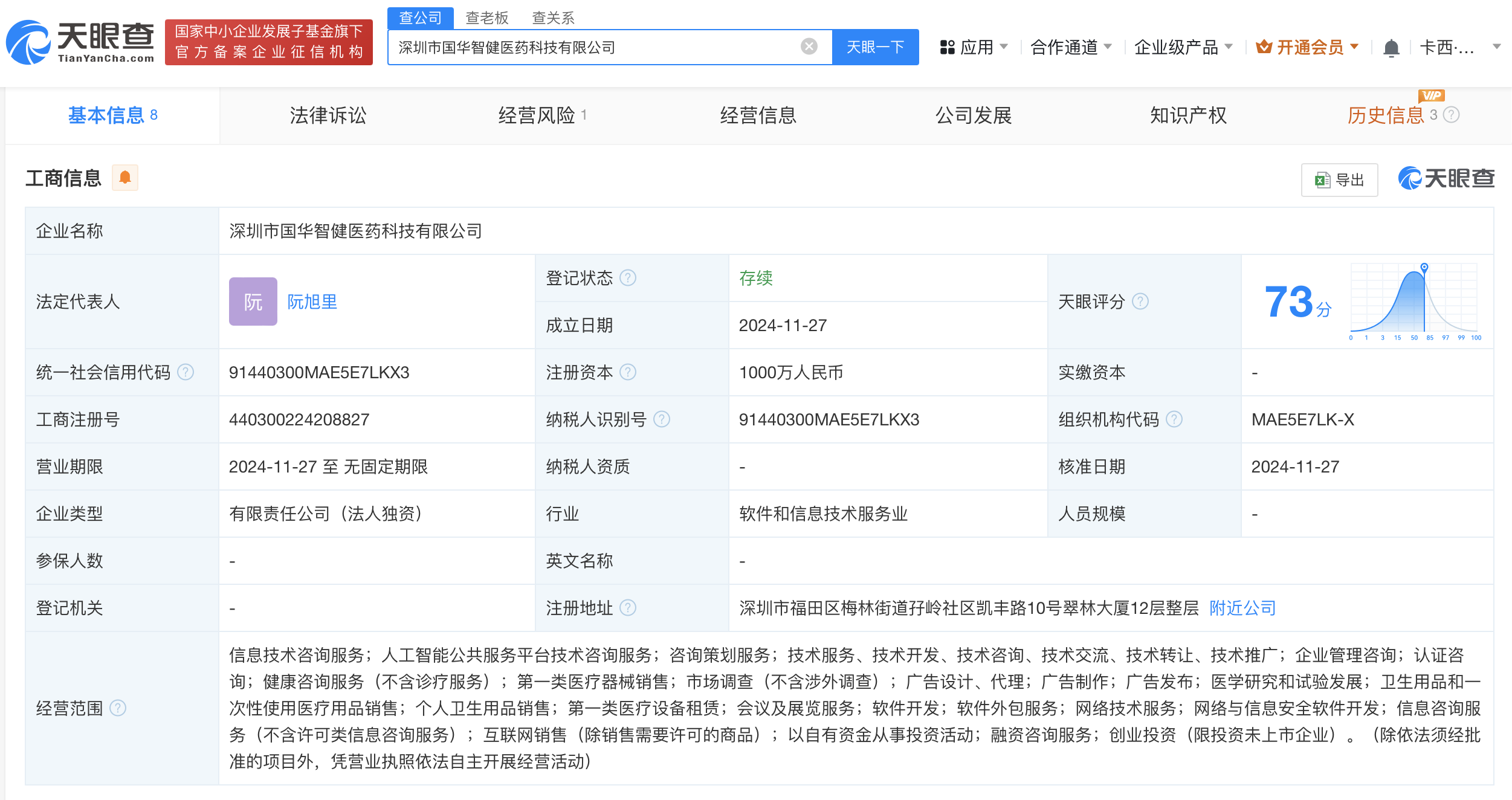 天眼查App显示,近日,深圳市国华智健医药科技有限公司成立,法定代表人为阮旭里,注册资本1000万人民币,经营范围含信息技术咨询服务、人工智能公共服务平台技术咨询服务、医学研究和试验发展、互联网销售等。股东信息显示,该公司由国华网安(000004)全资持股。